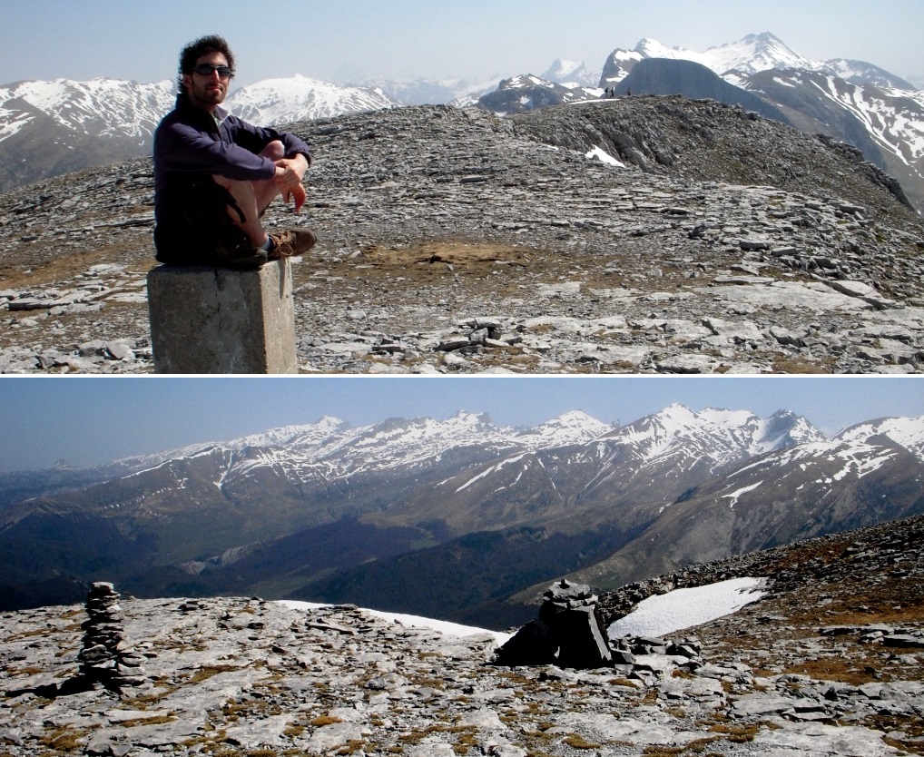 Diez minutos después estábamos ya en la cima, adornada por varios montones de hitos y por un vértice geodésico.