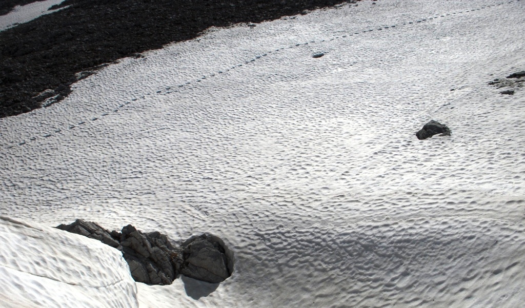 Después de más de una hora disfrutando de la cima, nos dispusimos a iniciar el descenso por el mismo sitio por el que habíamos subido pero atravesando uno de los nieveros para dejar huella de nuestro paso por la Peña Ezkaurre.
