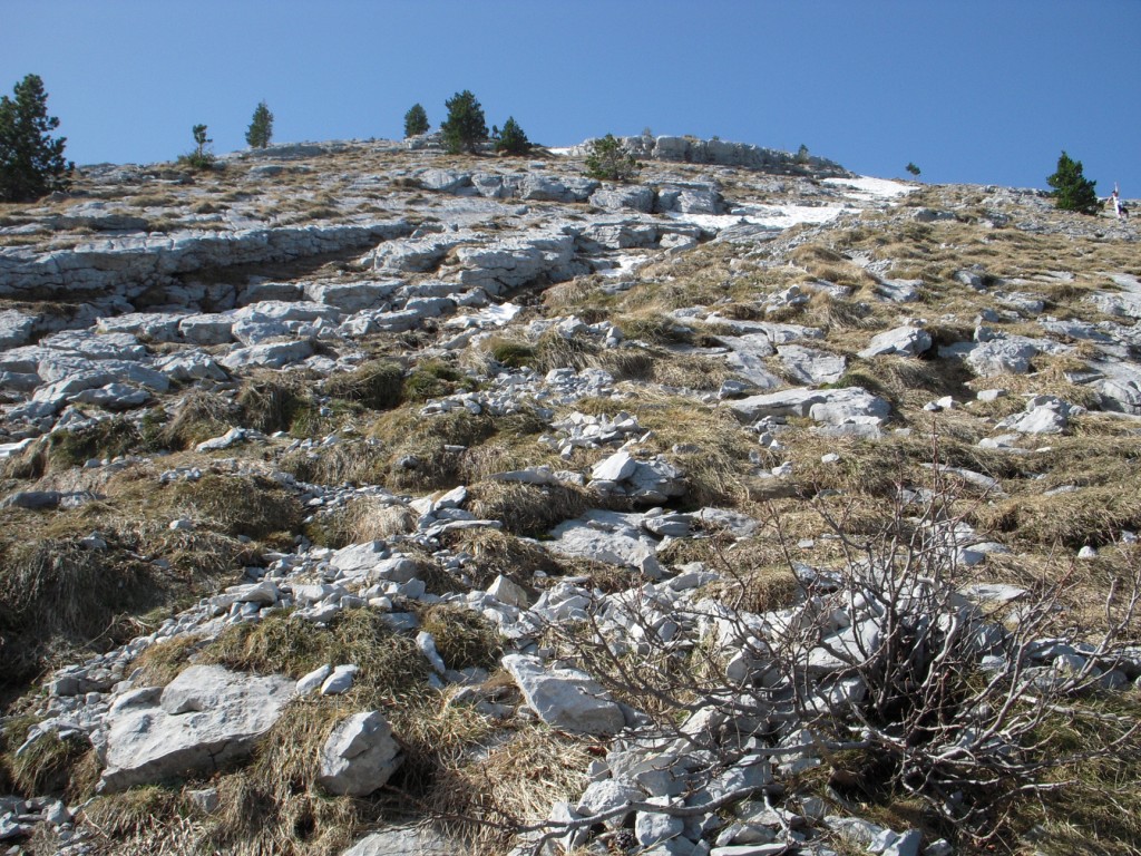 Poco más de 2 km después del inicio de la caminata, salimos del bosque y llegamos al Collado de Abizondo (a unos 1620 m de altitud, aproximadamente). Aquí nuestro equipo se divide, pues no resulta difícil sucumbir ante la imponente pala que nos separa de la cima (tras la ruta, y como buen matemático, calculé la inclinación media de este trozo y es de aproximadamente 25º, superando en algún tramo los 35º).