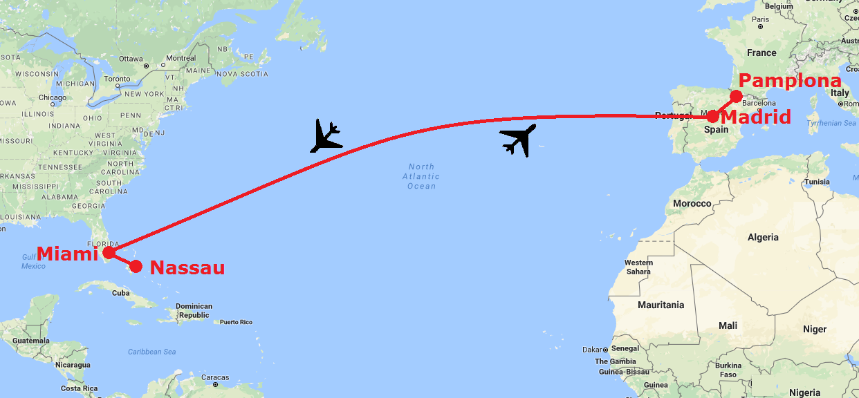 Aprovechándome de que tanto Iberia como American Airlines pertenecen a la misma alianza (One World), conseguí comprar el billete de ida y vuelta Pamplona-Miami-Nassau-Miami-Pamplona por 1030€.