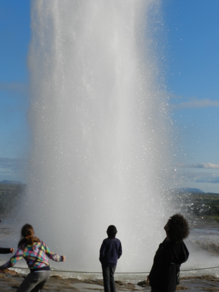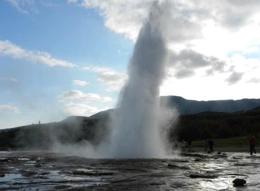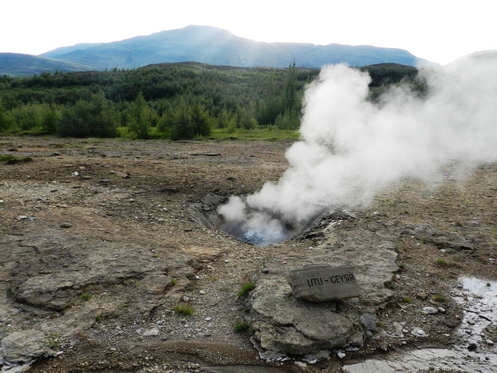 La palabra geyser viene precisamente de Geysir, llamémosle «el geyser original» y que ha dado nombre a todos los geyseres del mundo. Desgraciadamente, Geysir se encuentra casi totalmente inactivo desde hace bastante tiempo. Dicen que la gente comenzó a tirarle piedras y acabó de alguna manera taponándolo… no sé yo si, después de ver la fuerza de erupción del geyser vecino, eso es posible, pero la conclusión es: RIP Geysir.