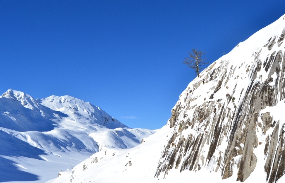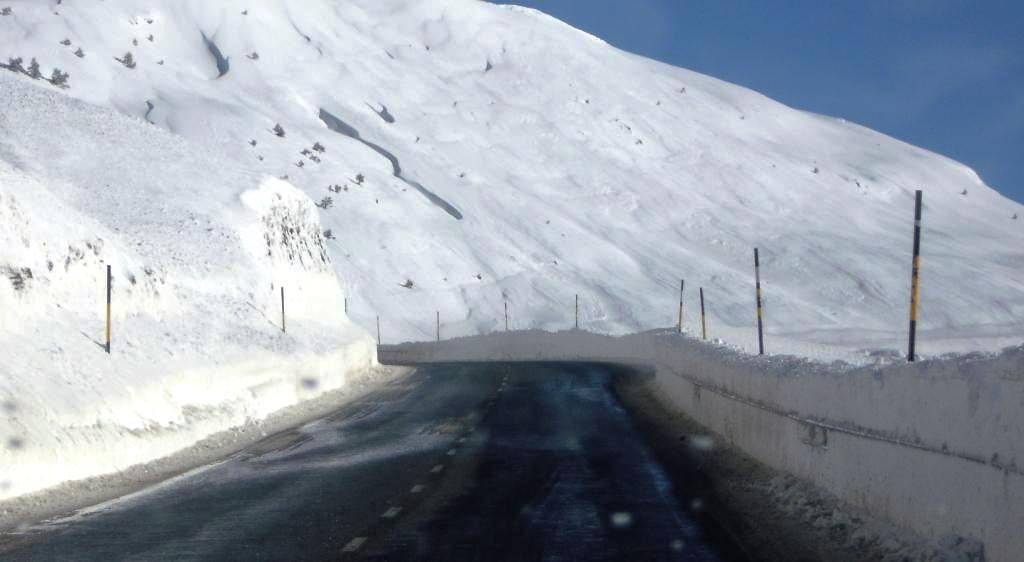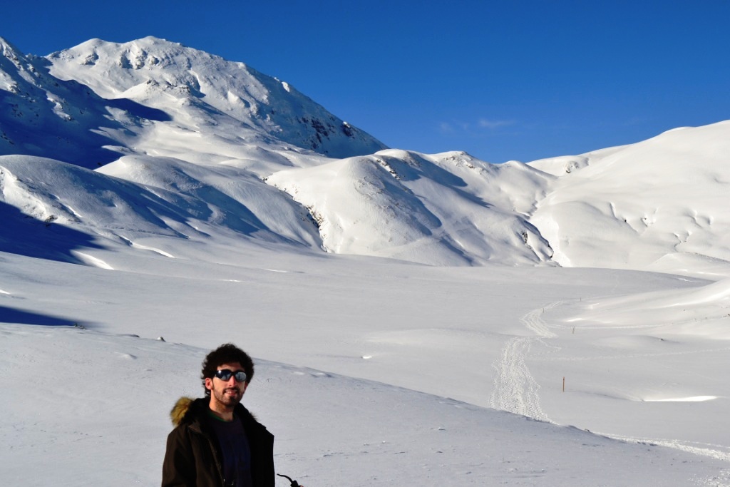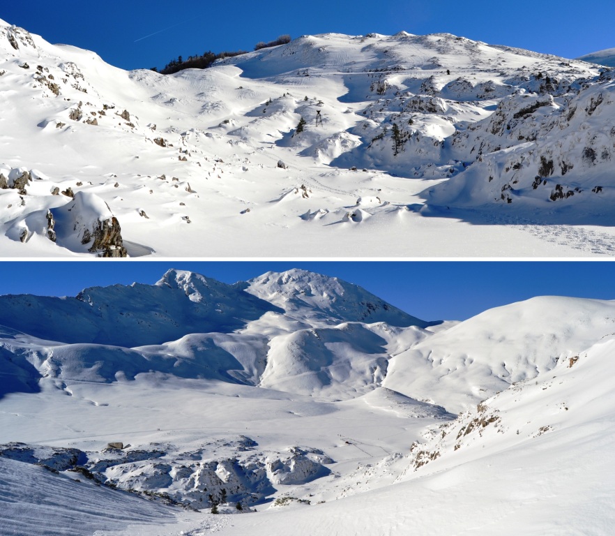 Siguiendo el camino, vamos bordeando la ladera que queda a nuestra derecha mientras atravesamos esta llanura cubierta de un mar de nieve. Pronto nos encontraremos con una bifurcación que nos lleva al lugar de Ligoleta o nos deja frente a una ladera que tendremos que subir para remontar altitud. Es fácil distinguirla por una especie de pequeña torre o construcción metálica que debemos dejar a nuestra derecha.