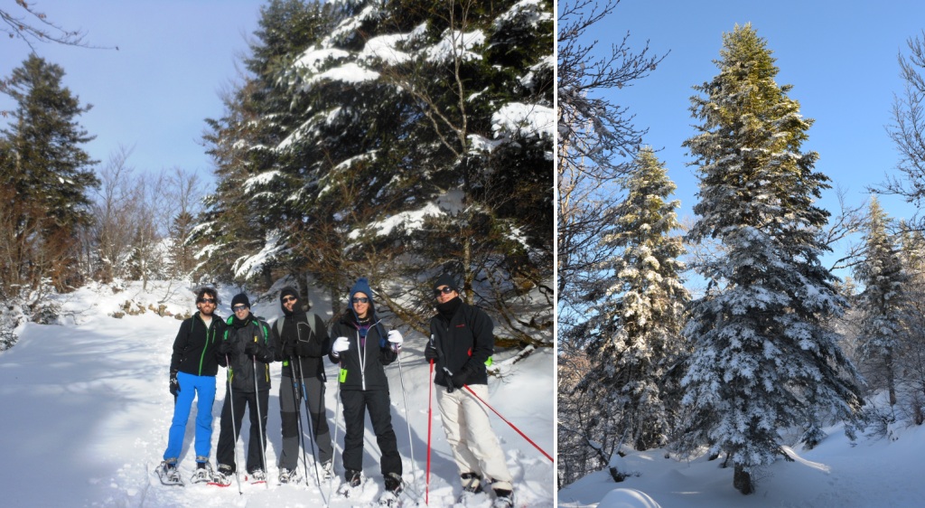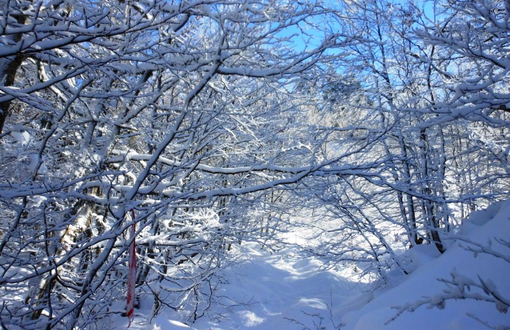 Desde este mágico enclave, nos acercamos al paso final de esta ruta con raquetas. Siguiendo de frente con nuestra vista siempre clavada en el Pic D’Anie, entraremos de lleno en un frondoso pinar que nos obligará a ascender un buen tramo por caminos relativamente estrechos, entre árboles, hasta que consigamos recuperar la altitud inicial y salir a la carretera.