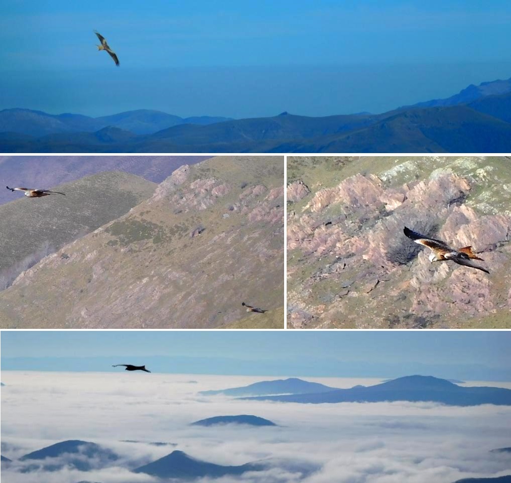Mientras jugábamos un poco con el perro, éste detectó presencia animal y fue a su encuentro, pero estaban fuera de su alcance. Justo encima de nosotros, aparecieron un par de, me atrevo a aventurar, águilas reales, que estaban aprovechando las corrientes de aire para planear. ¡Preciosas!