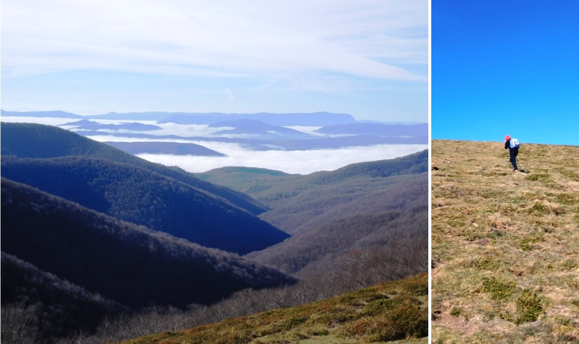 Sin prisa pero sin pausa, vamos abordando la ladera poco a poco ya que las condiciones meteorológicas permiten hacerlo sin prisas. Mientras subimos, podemos contemplar a ambos lados las vistas tanto de la zona del Baztán como de la vertiente vasca, que en este caso estaba bañada por una intensa niebla baja de la que tuvimos la suerte de escapar.