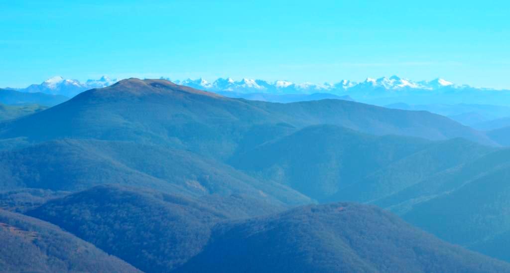 Miremos hacia donde miremos el espectáculo está servido. Hacia un lado se distingue el Larrun y Donostia, también el Adi, hacia otro la zona fronteriza entre Euskadi y Navarra, a lo lejos el Pirineo marcado por el Ori, el Pic D’Anie el Midi D’Ossau y el Castillo D’Acher entre otros, y justo delante de nosotros el Zuriain que tapa ligeramente a la Higa de Monreal y la Peña Izaga, situados detrás de él al fondo.