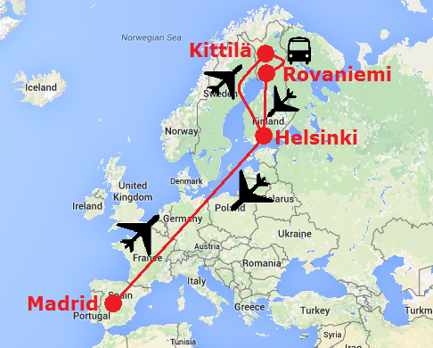 Para llegar a Kittilä, donde me recogerán los organizadores del Tour de Esquí de Fell Trek, saldré de Marid en avión hacia Helsinki y después desde allí otro avión hasta Kittilä. Para volver saldré de Kittilä en autobús para ir a Rovaniemi (300 km al sur) para así conocer la «capital de Laponia» (y de paso ahorrarme 300 € en el billete de avión) y, desde Rovaniemi, volaré de vuelta a Helsinki y a Madrid. Los billetes de avión los he cogido con Finnair que es la compañía con la que volé hace dos años a Laponia también. Cogido con tiempo, tienen unas tarifas bastantes competentes y la facturación de los esquís es muy, muy barata. El autobús para trasladarme de Kittilä a Rovaniemi lo he cogido con la compañía Matkahuolto.