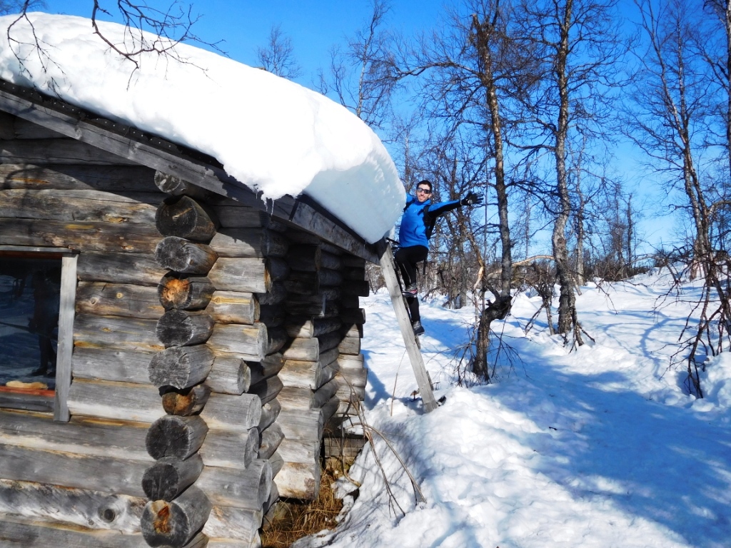 Después de una buena ascensión llegamos a la primera parada del día: Hannukuru. Una cabaña con unas escaleras congeladas que permiten el acceso a ella y que parecen más una trama mortal que una ayuda… En esta cabaña nos encontramos con otro grupo de esquiadores (alemanes, of course) pero con mayor interés en entablar conversación con no-alemanes que los de mi grupo. ¡Ya me había olvidado de lo que era hablar con seres humanos!