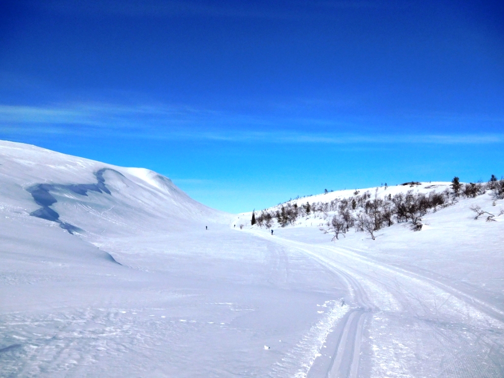 Con energías recuperadas después del descanso en la cabaña de Hannukuru, seguimos esquiando por una llanura hasta que salimos del bosque y entramos en la inmensidad de Tunturi Fell, un paisaje completamente diferente a lo que estábamos acostumbrados.