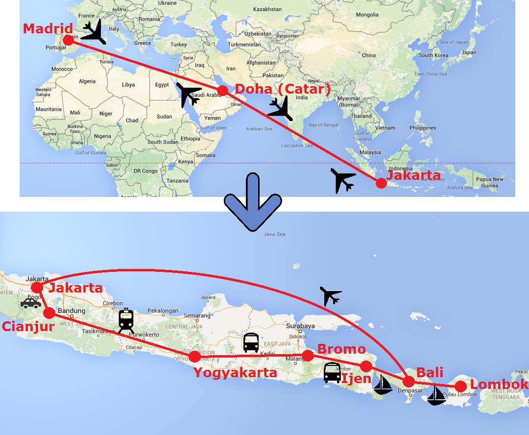 Para llegar a Indonesia volaré desde Madrid a Jakarta (capital de Indonesia, en la Isla de Java) haciendo escala en Doha (Catar). Recorreré la esta isla durante aproximadamente 11 días haciendo las siguientes paradas: