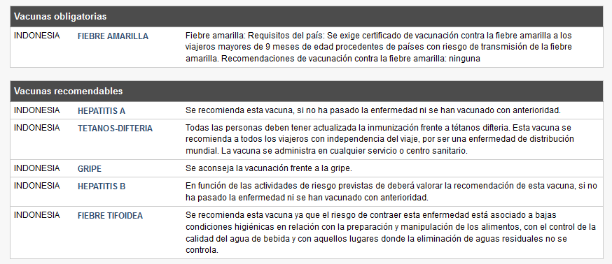 Las vacunas y enfermedades: no hay ninguna vacuna obligatoria para ir a Indonesia (salvo la fiebre amarilla en un supuesto que no cumplo). Desde el Ministerio de Sanidad, se recomiendan las siguientes:
