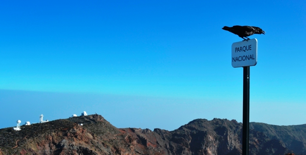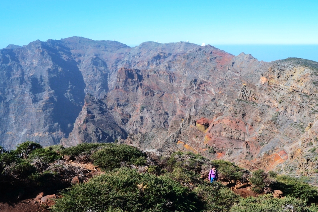 Detrás de la caseta, un camino empedrado nos lleva a dos miradores. Desde el último de ellos (Espigón de Roque) se abre de nuevo ante nuestros ojos la inmensa Caldera de Taburiente, solo que esta vez vista desde su punto más alto. Si no hubiese calima se podría distinguir mejor el Mirador de La Cumbrecita a lo lejos, donde habíamos estado el día anterior. Echando la vista atrás vemos una buena colección de telescopios con el océano al fondo.