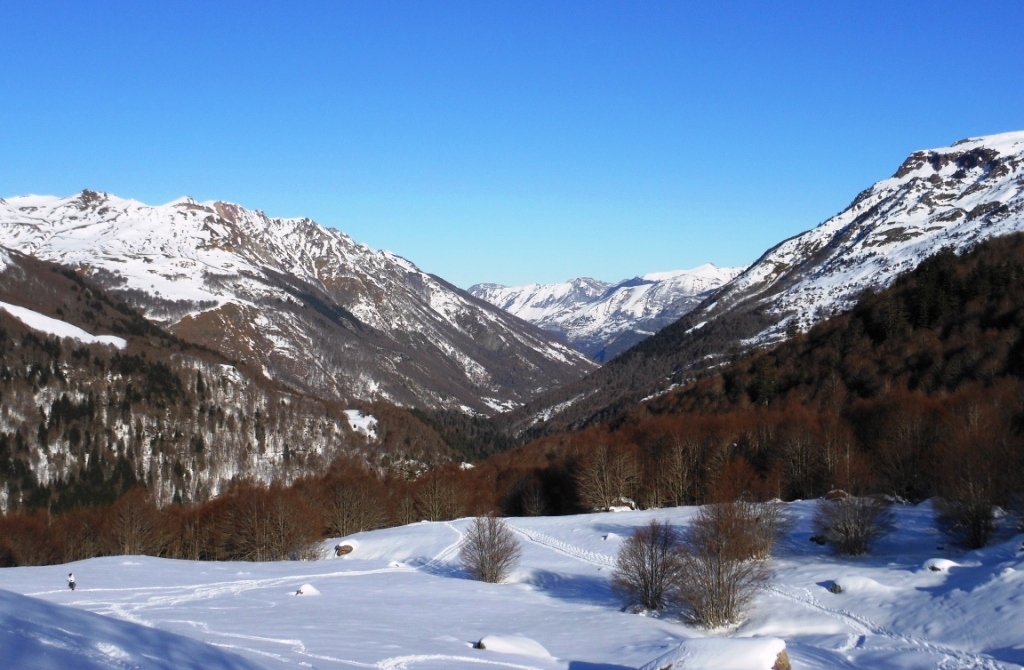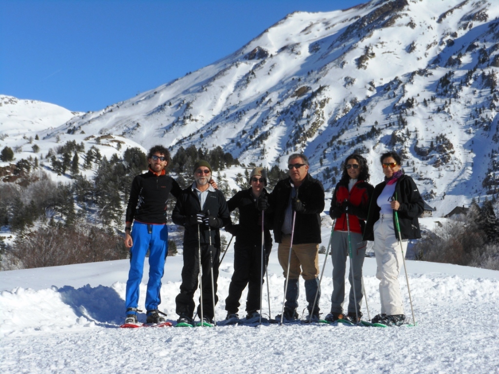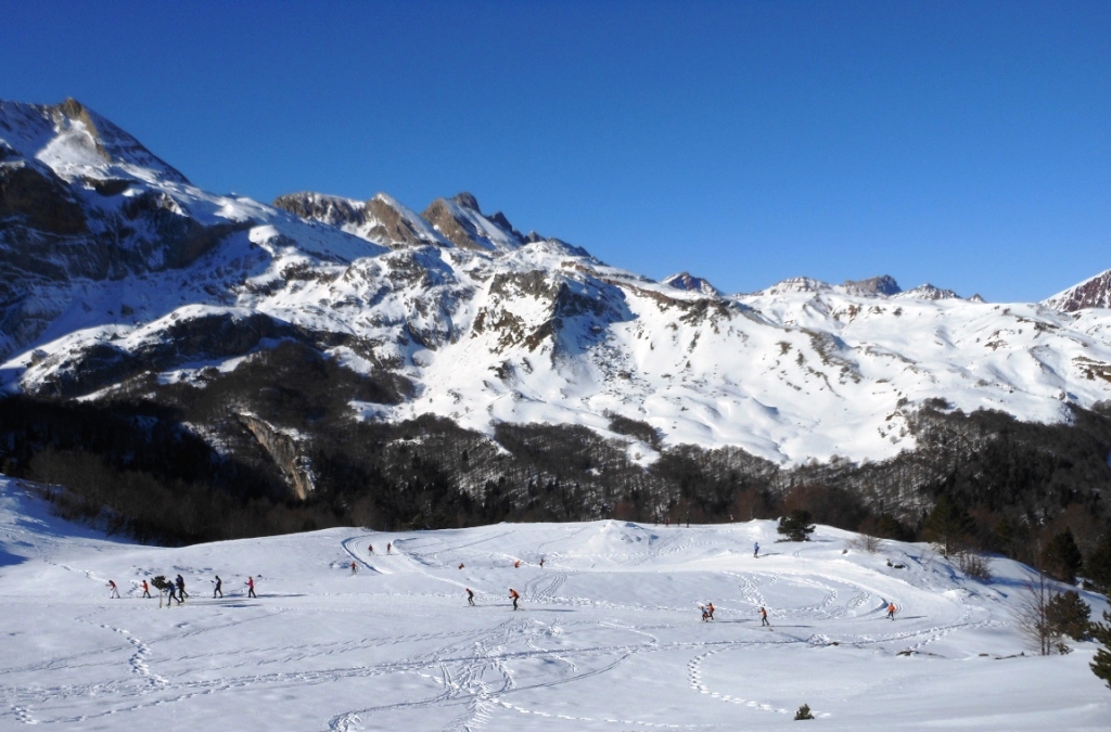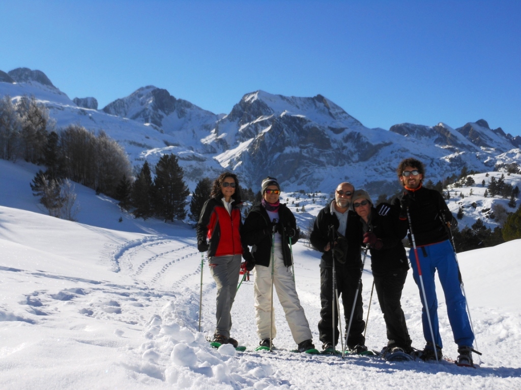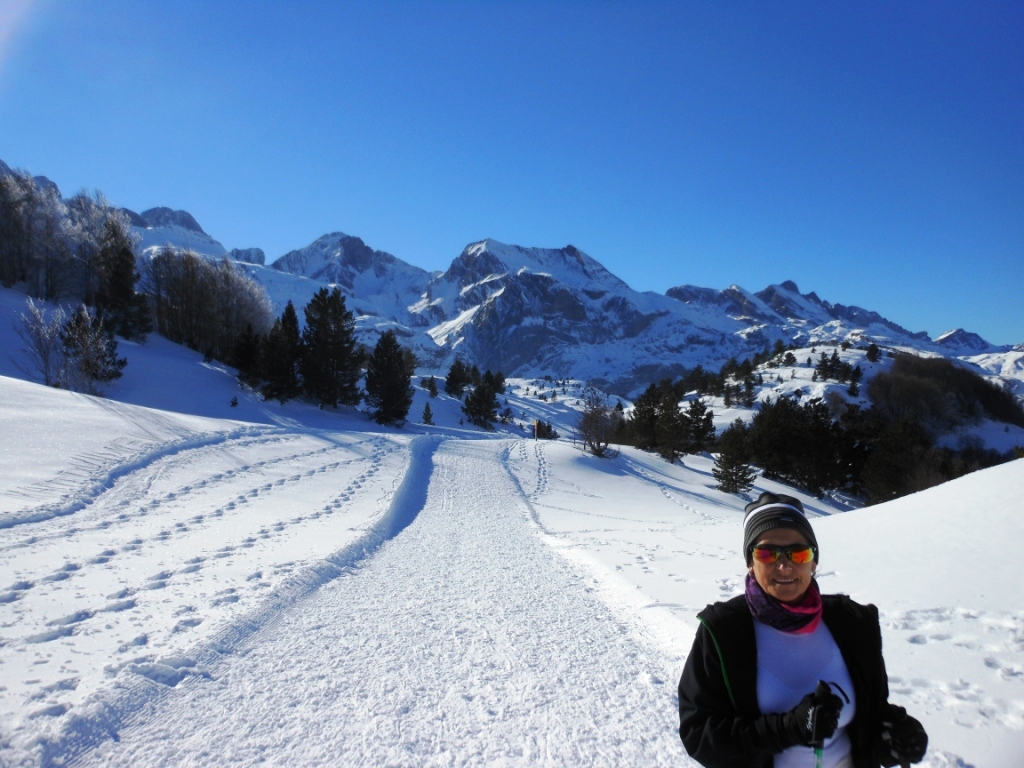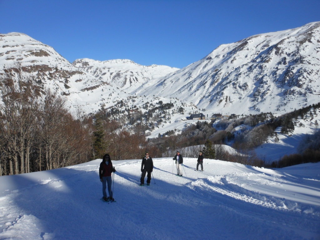 A lo largo de este bonito recorrido con raquetas se llega a entender bien los distintos entornos de la estación: grandes llanuras, algunas subidas y bajadas y pequeños bosques, todo ello limitado por los imponentes Pirineos que se levantan ante nuestros ojos en cualquier dirección.