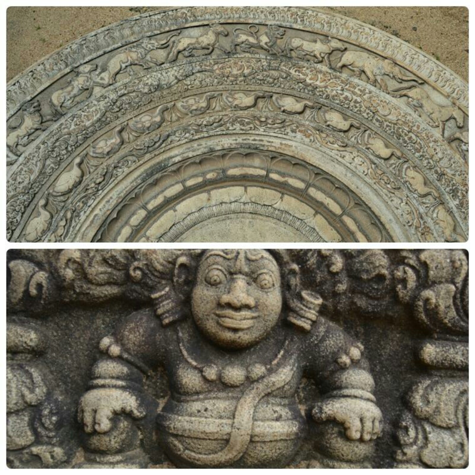 Seguí en bici dirigiéndome al noreste de Eth Pokuna para contemplar la Moonstone (Piedra Lunar) más elaborada de Sri Lanka que originalmente adornaba una escuela de monjes construida en el siglo IX d.C. Me resultó divertido intentar reconocer cuántos tipos de animales están tallados. No hay que dejar pasar por alto tampoco los detalles de los escalones que están junto la base de la piedra.