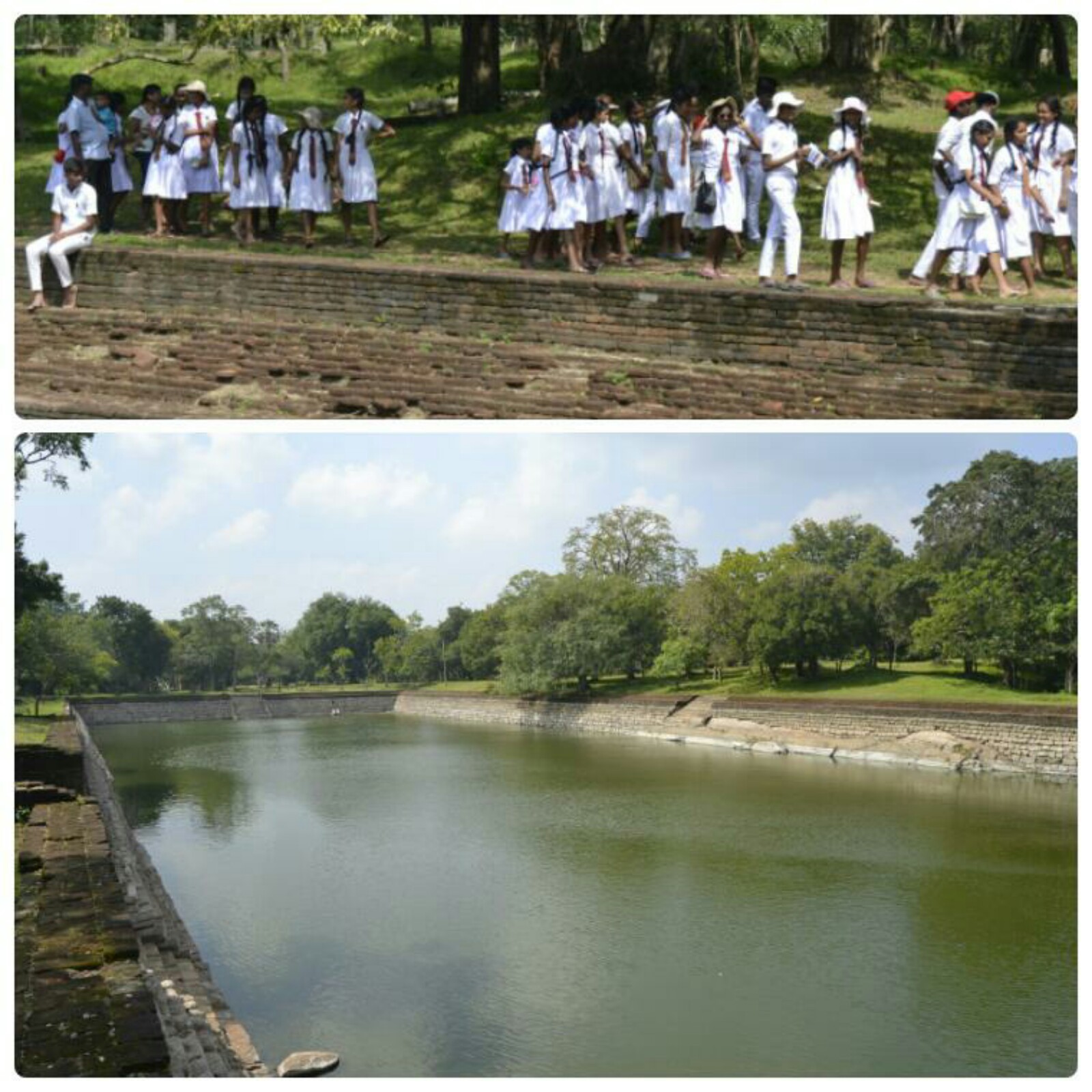 Junto a esta estatua destacan también los Estanques Gemelos (Kuttam Pokuna) que, personalmente, no me aportaron nada. Bastante más espectacular me pareció el Estanque de los Elefantes (Eth Pokuna), una barbaridad de agujero en el suelo que debió servir de almacén de agua para los monjes del antiguo monasterio. Mide 159 x 53 x 10 metros, por lo que sí que perfectamente habría podido ser una piscina de elefantes (aunque se considera muy poco probable). Justo apareció en ese momento una excursión de instituto que me recordó lo que estaba haciendo hace poco más de dos semanas…