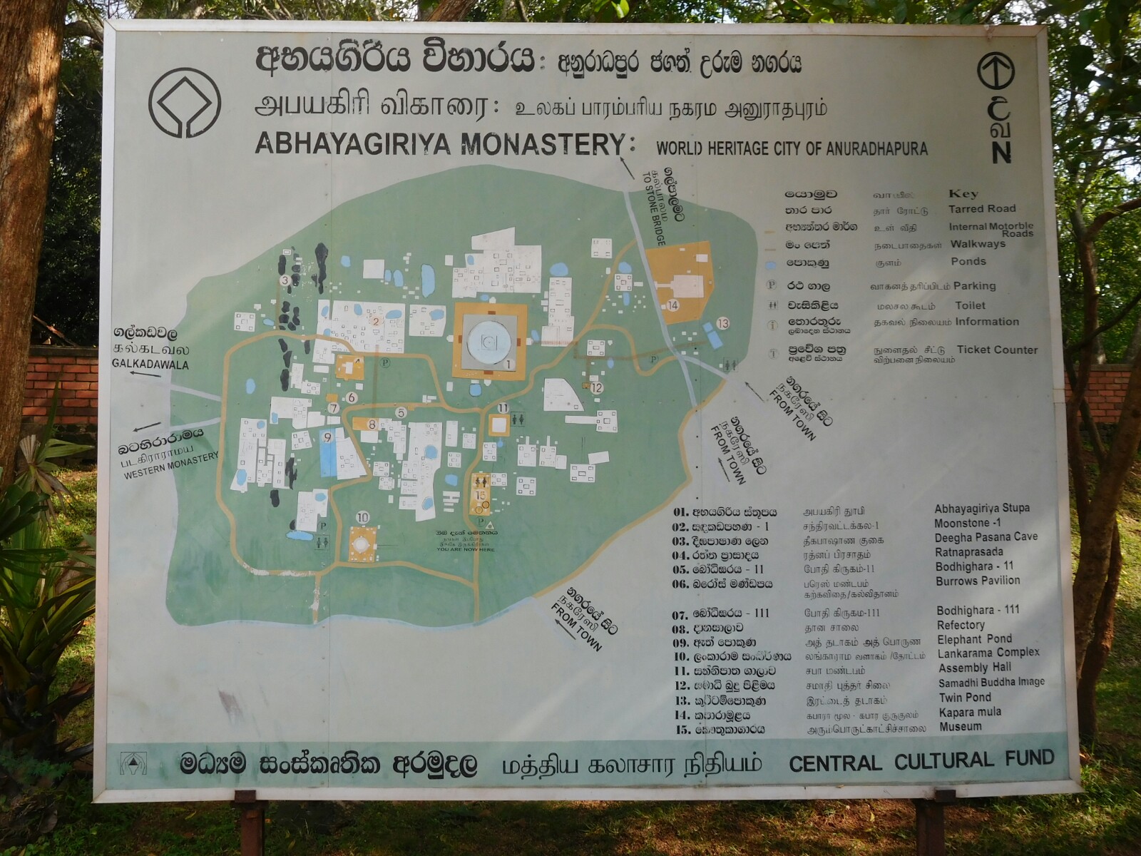 Casi 2 km al norte de la Dagoba Thuparama llegué al Museo Abhayagiri, una de las entradas al recinto. Aquí hay un mapa enorme señalando de forma muy clara dónde se encuentra cada una de las construcciones que se pueden visitar, y que me ayudó bastante a planificar el recorrido por este bonito parque cargado de energía espiritual e historia.