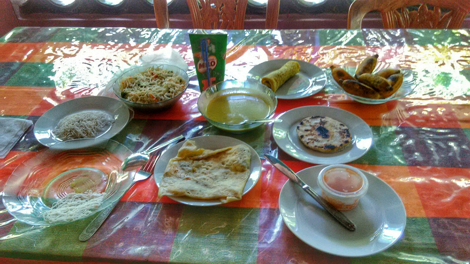 Los desayunos de las guest house y homestay de Sri Lanka están en general bastante bien, pero el de aquí fue simplemente supersónico. Tuve que convencer a los canadienses para que comiesen algo ellos también, ya que me habían traído string hoppers con un curry, noodles con verduras, un roti de huevo y un roti de coco, dos huevos fritos, un pancake, plátanos… ¡Para un regimiento!