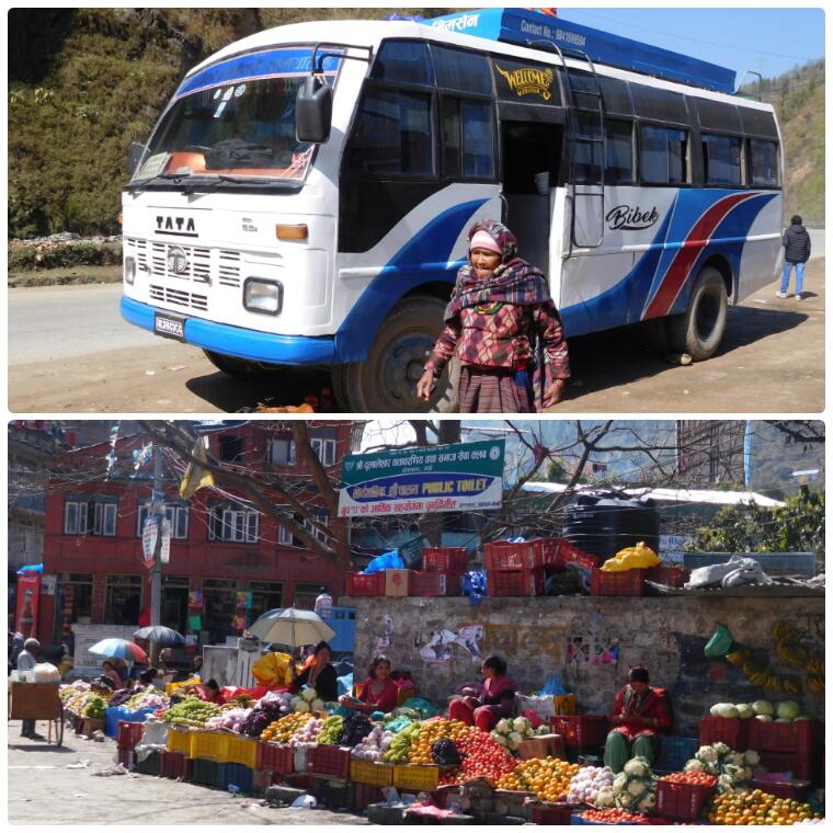 Salimos de Dhulikhel bastante temprano para intentar evitar calores máximos a la hora de subir a Saping. Desde la Innate Pension nos fuimos al centro de la ciudad para coger el autobús con destino a Dolalghat (70 NPR, 1 hora). Por el camino pudimos disfrutar de unas nuevas y espléndidas vistas de los Himalayas.