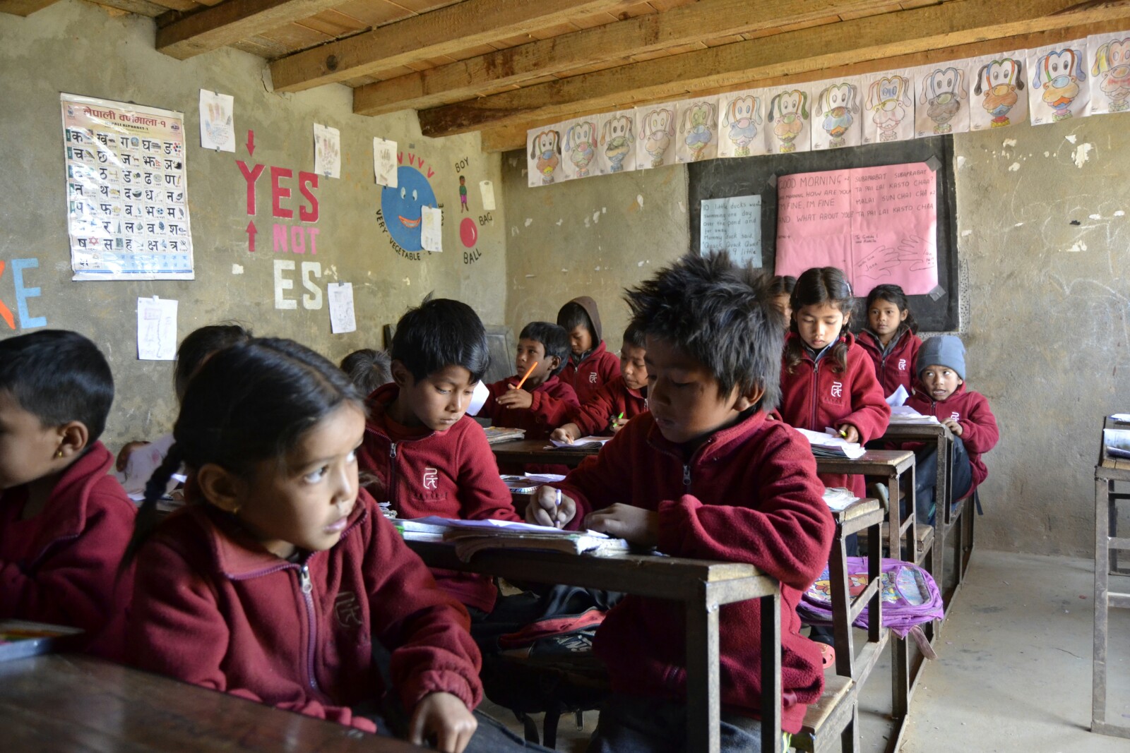 Las clases son muy acogedoras y se nota el trabajo realizado por Uttam y todos los profesores y las profesoras que han pasado por esas paredes a lo largo de estos años: dibujos, murales, materiales… todo se va acumulando para que la educación de las nuevas generaciones de Saping sea cada vez mejor.