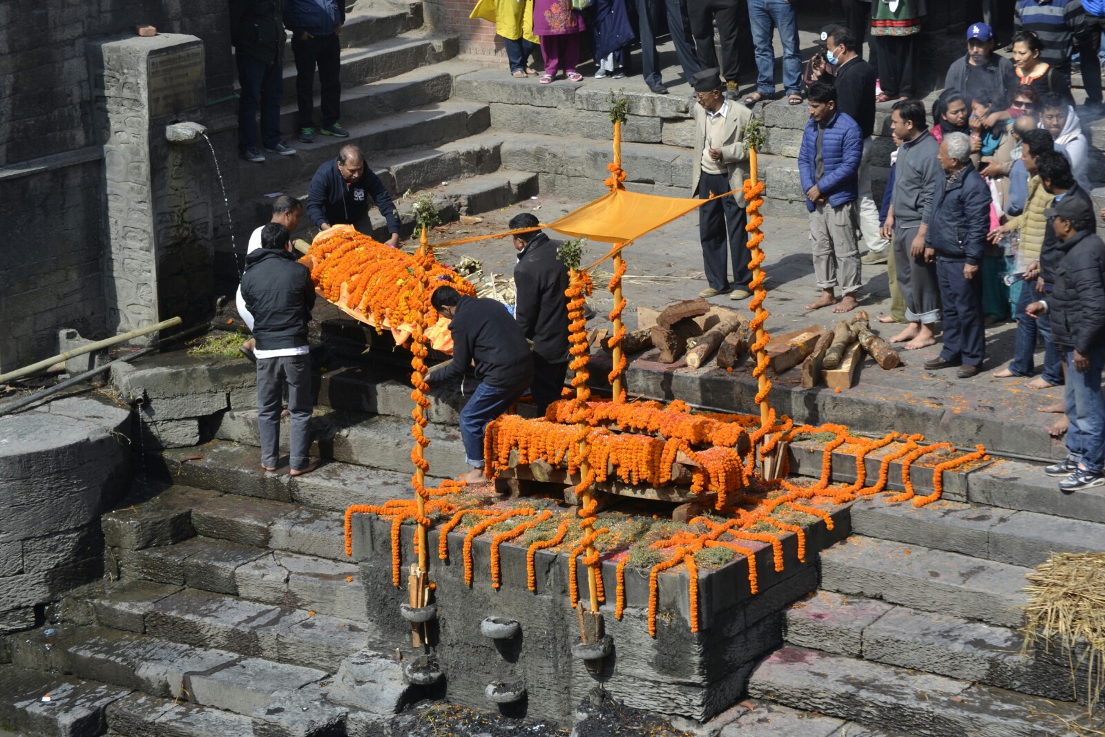 Cuando ya están listos, los levantan y los pasan junto a una pequeña construcción estilo mini-templo donde tiene lugar la despedida final antes de llevarlos a las piras funerarias donde, literalmente, los queman.