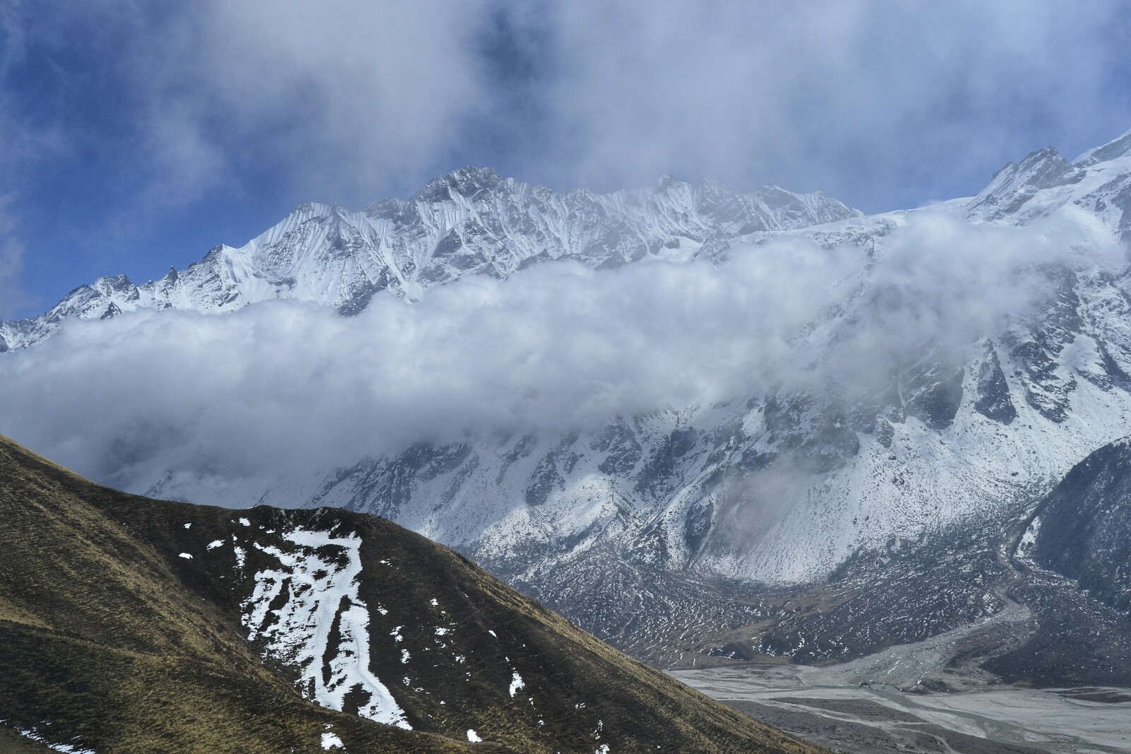 Hasta ahora hemos tenido un tiempo maravilloso. Pero todos los días a partir de la 1 o las 2 de la tarde, entra una capa de nubes densa a más no poder desde el oeste que se disipa cuando llega la noche. Este día no podía ser menos y, desde la cima, pudimos ver a lo lejos como la capa de nubosidad iba avanzando poco a poco cubriendo primero el poblado de Langtang, después Kyanjin y, por último, las montañas más cercanas a nosotros.