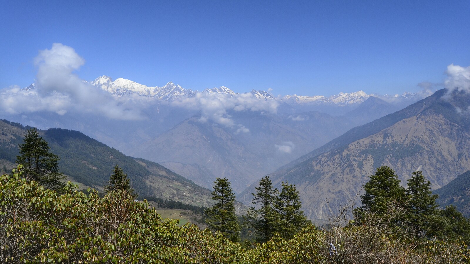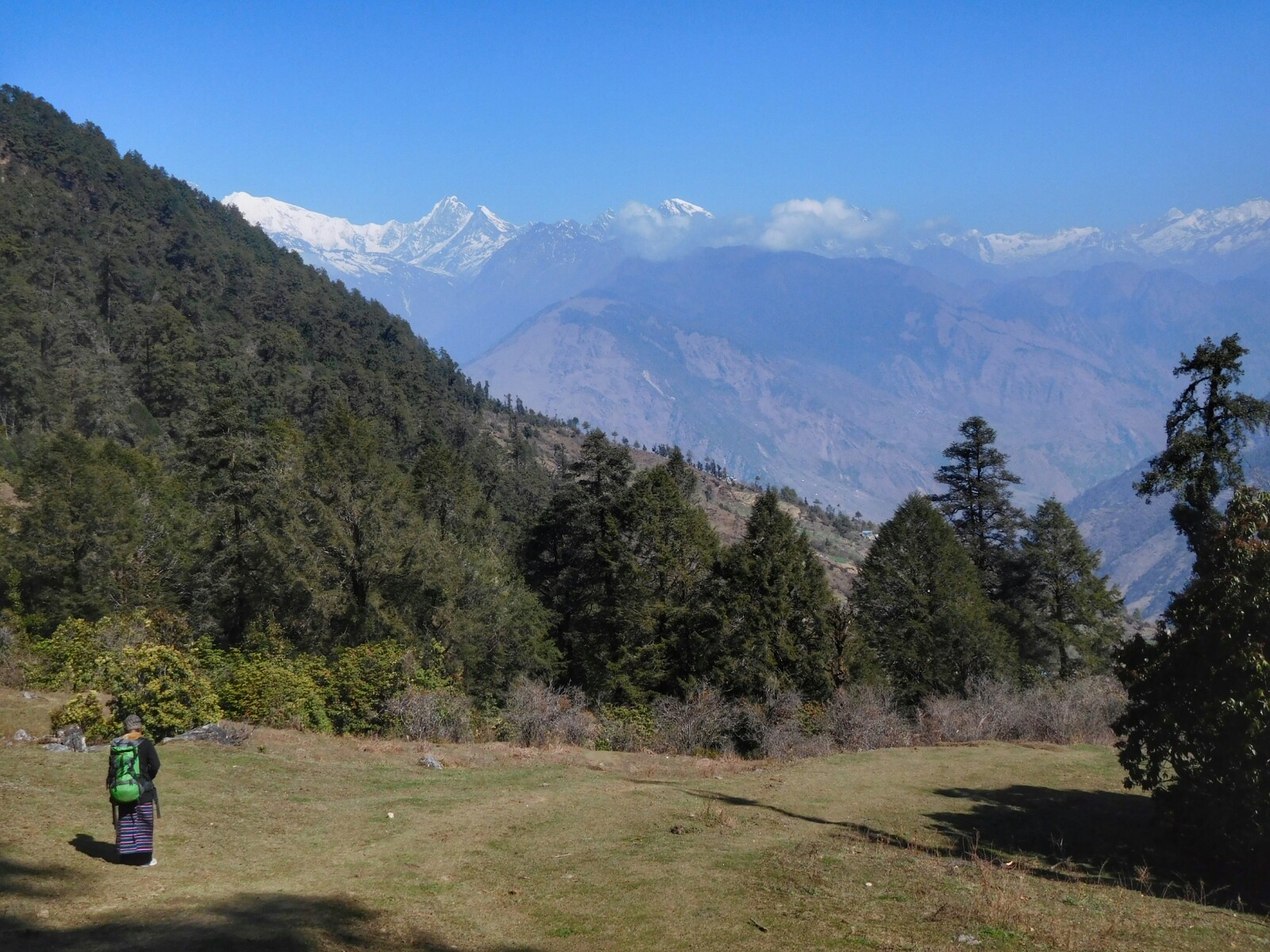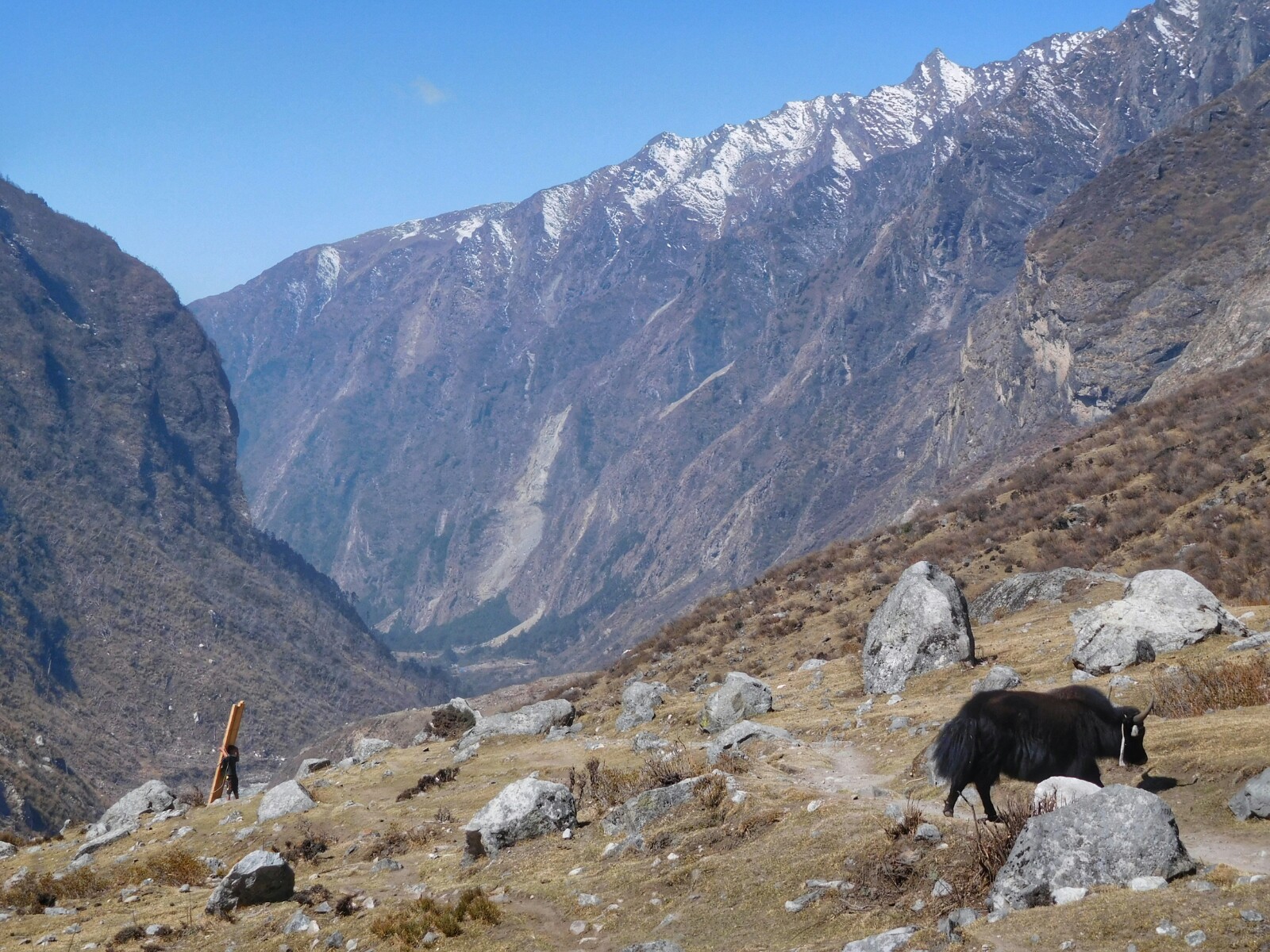 Para nosotros la parte del trekking correspondiente a Gosaikund-Helambu empezó hoy. Tras pasar la noche en Lama, continuamos el prolongado descenso que ya habíamos iniciado ayer desde Kyanjin Gumba acompañados por otro hermoso día primaveral con unas vistas clarísimas de nuestro destino, Thulo Syaphru, en la lejanía.