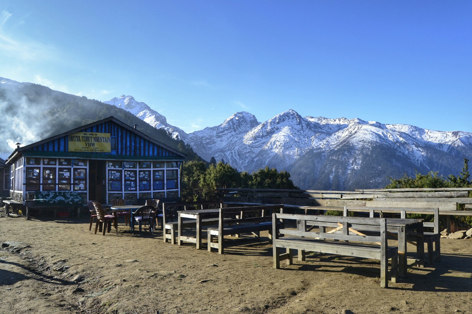 Antes de iniciar la caminata salí del Hotel Langtang Lirung View a las 7:30 para estirar las piernas y relajarme un rato con los primeros rayos de sol del día y las estupendas vistas de las montañas.