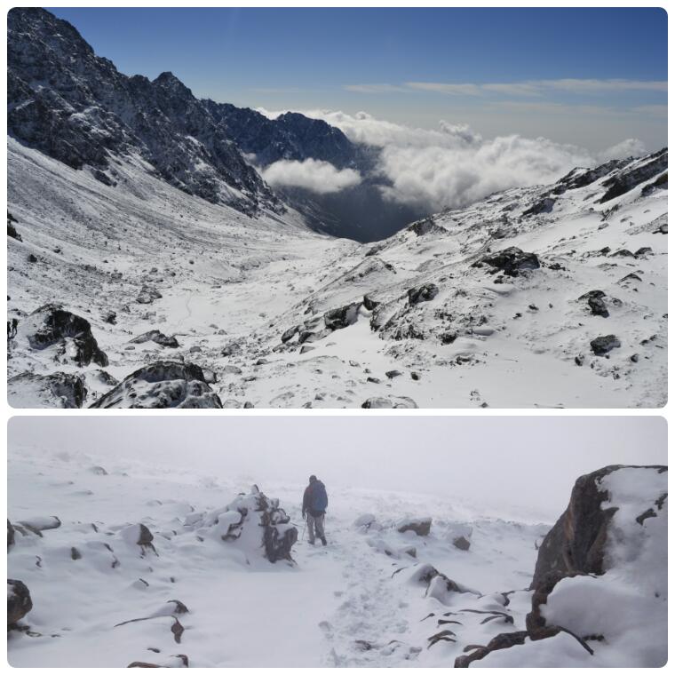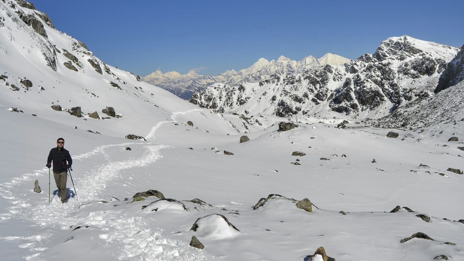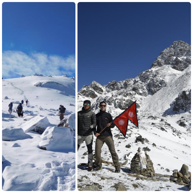 Poco después el Lauribina Pass (4640 m) empezaba a vislumbrarse en la lejanía. Seguimos caminando por la nieve fresca recibiendo los cálidos rayos de sol de la mañana. Estaba claro que, como ya iba siendo costumbre, frío no iba a hacer.