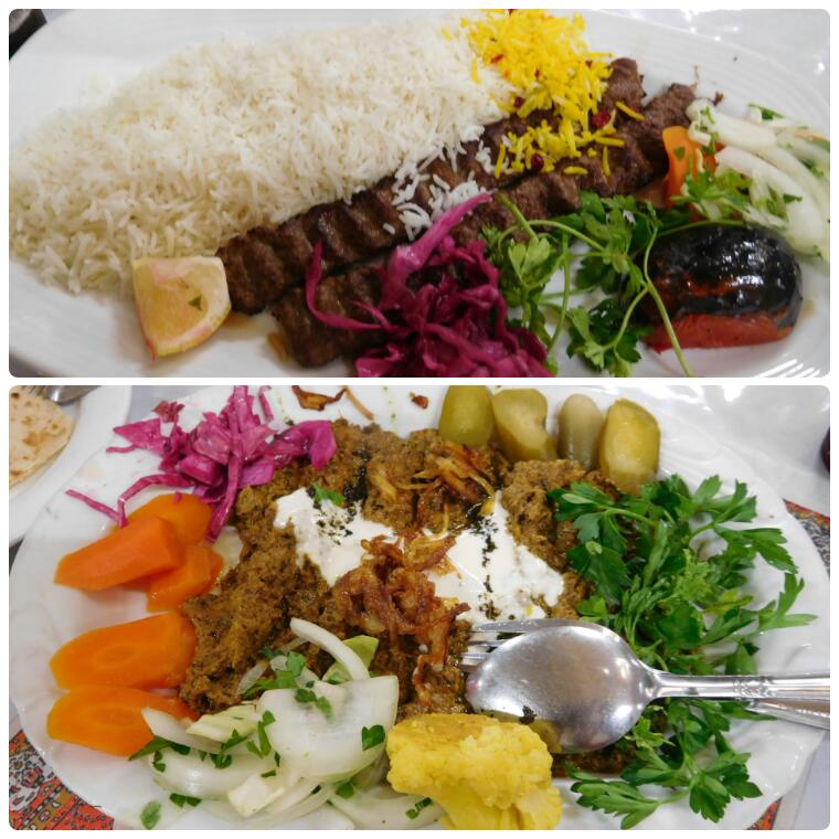 Decidimos pedir tres platos diferentes para compartir entre los dos y así poder probar varias cosas. Empezamos con una Ensalda Shirazi (pepino, tomate y cebolla con menta seca, limón y aceite de oliva) y de segundo Chelo Kebab Koobideh (ternera con cebolla y alubias acompañada de tomate a la plancha y arroz iraní) y Kashk-o Bademjan (puré de berenjena con mezcla de especias y tomate acompañado de yogur seco, menta, nueces, cebolla y ajo). Un auténtico banquete.