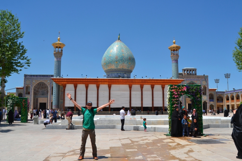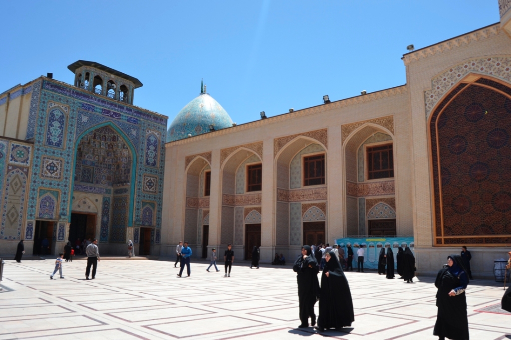 Sofia ya había visitado el santuario Aramgah-e Shah-e Cheragh y se quedaba sin tiempo, así que nos acompañó hasta allí antes de irse a recoger a su hostal. Hicimos una parada fugaz en la Madraseh-ye Khan donde dos tipos muy avispados sentados en ambas sillas a la entrada nos pidieron 50.000 IRR. Yo sabía que era gratis y Noe dudó también inmediatamente porque tenían pinta de todo menos de vendedores de entradas.
