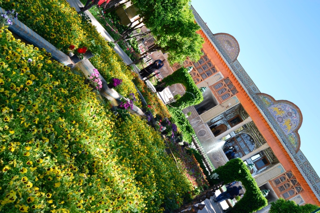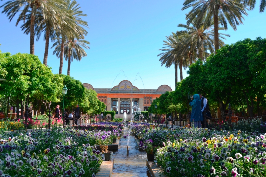 Los jardines son pequeños pero muy tranquilos y bien cuidados. Desde la entrada se extiende un largo pasadizo de pensamientos de diferentes colores, como si fuese una alfombra que conduce al palacio situado en la otra punta del recinto, el Naranjestan-e Qavam.