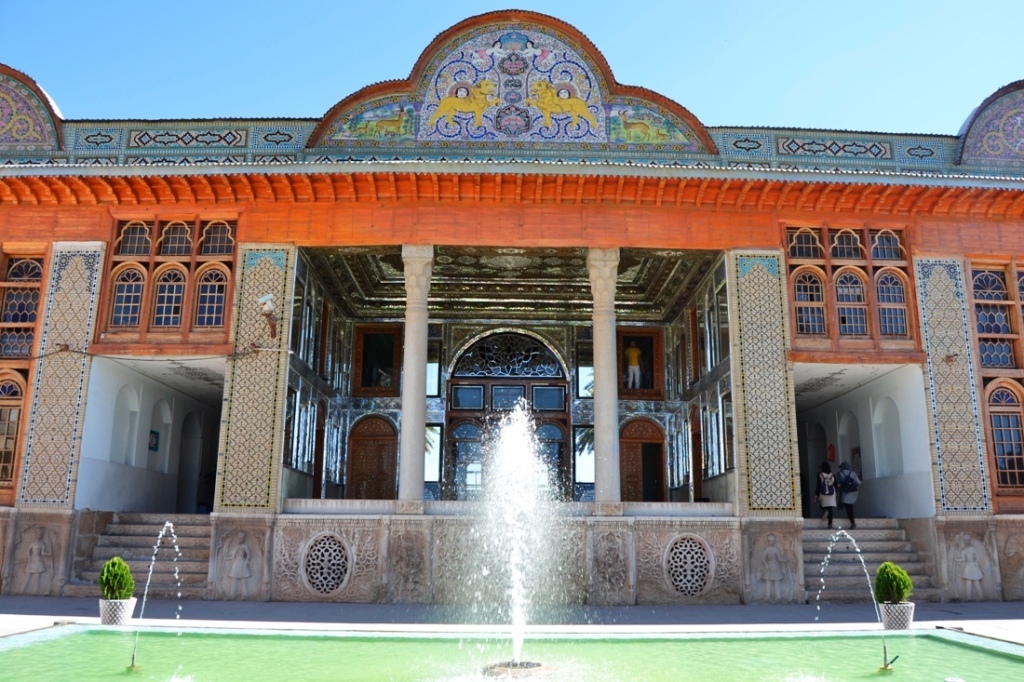 El ostentoso pabellón decorado con tantos cristales que crea reflejos discotequeros es de la segunda mitad del siglo XIX y se construyó como zona de recepción de la casa familiar de Mohammad Ali Khan Qavam al-Molk, que está adosada al mismo.