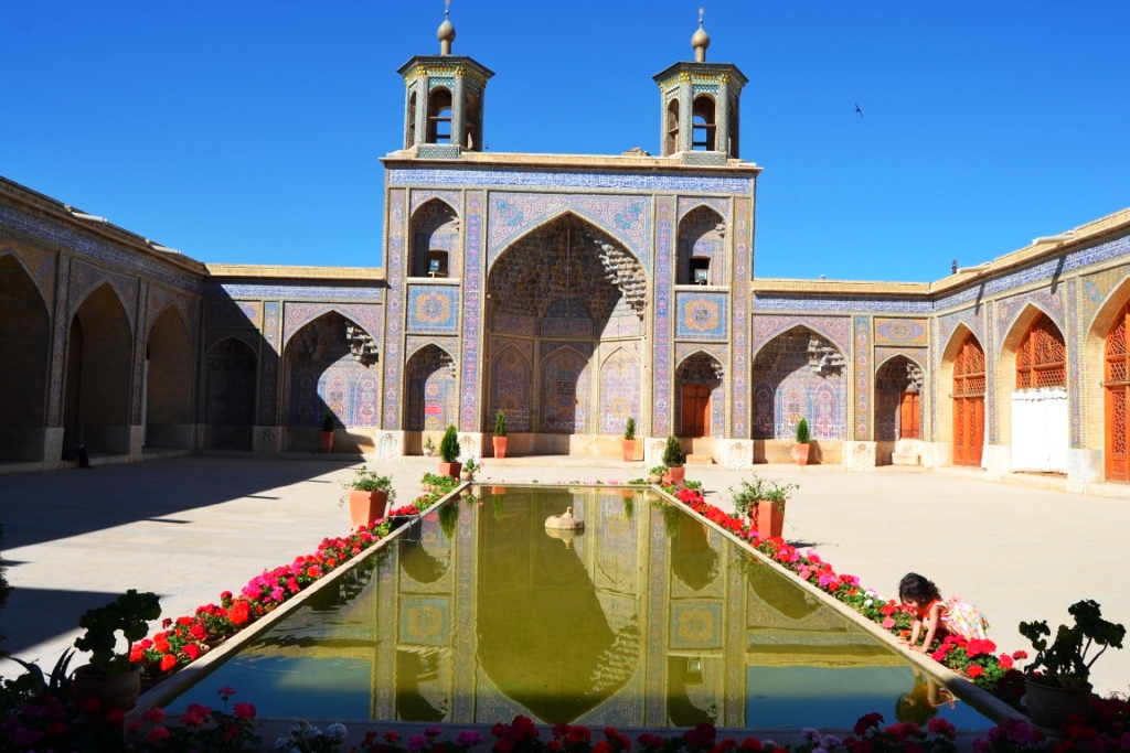 Yo creo que las cosas han cambiado desde que el turismo está empezando a crecer en Irán. Por lo que hemos podido comprobar el colorido se mantiene como mínimo hasta las 10 de la mañana. Tan famosa es la teoría del “hay que ir muy temprano” que a las 8 se congregan en la mezquita el 75% de los turistas de todo Shiraz para hacerse su foto en la pared final, aguantar 10 minutos y marcharse.