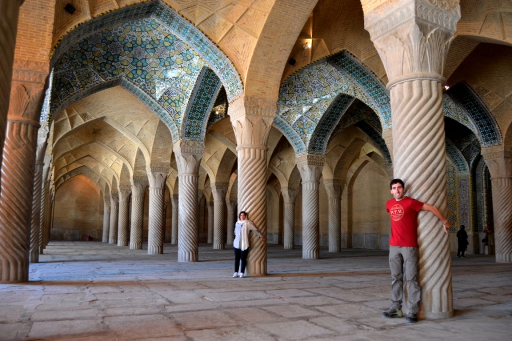Noe y yo nos adelantamos para visitar antes la Masjed-e Vakil (150.000 IRR), que el día anterior estaba cerrada. El taxi nos dejó casi la puerta y el sonriente y amable chico de las entradas me guardó la mochila grande del equipaje durante la visita a la mezquita y el bazar. Esta gente se desvive por sus turistas.