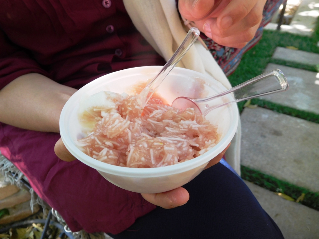 Aquí nos reunimos otra vez con Sofia, que tenía la mañana libre antes de emprender su camino hacia el oeste de Irán. La esperamos tranquilamente en uno de estos bancos observando a los locales y probando una de las especialidades de Shiraz: unos noodles congelados mezclados con helado que no me convencieron nada de nada.