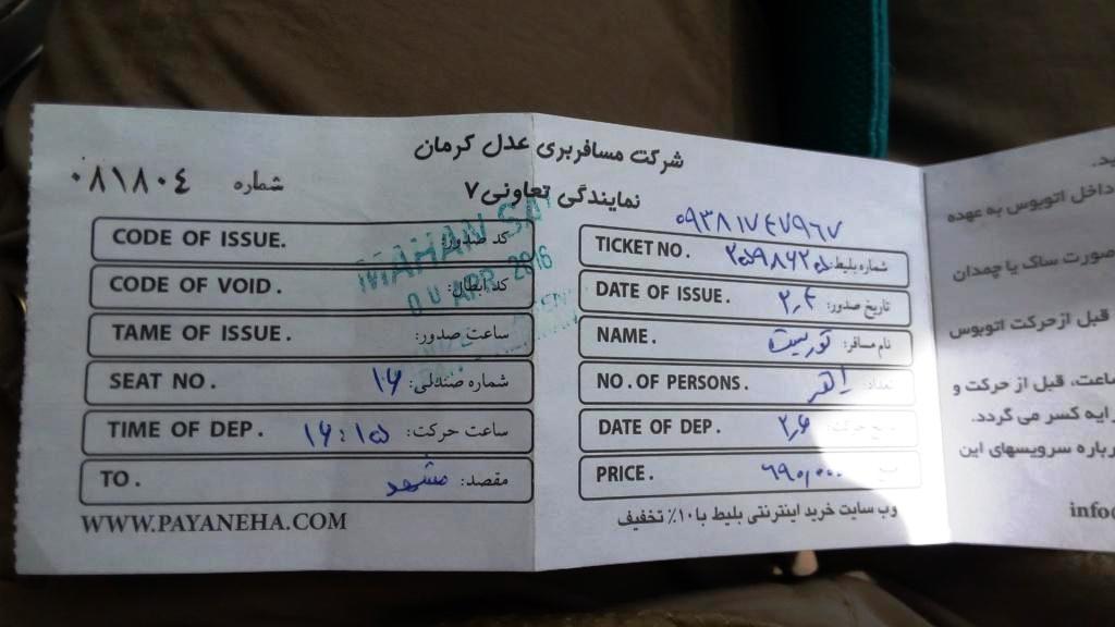 Esta inutilidad de saber inglés la conocí de primera mano en mis primeros cinco minutos en la ciudad. Acababa de llegar de una visita con noche incluida en el formidable desierto de Los Kaluts y, aprovechando que mi excepcional guía Beh aún seguía conmigo, aproveché para hacer una parada en una agencia de viajes para comprar un billete de tren o autobús de Kerman a Mashhad.