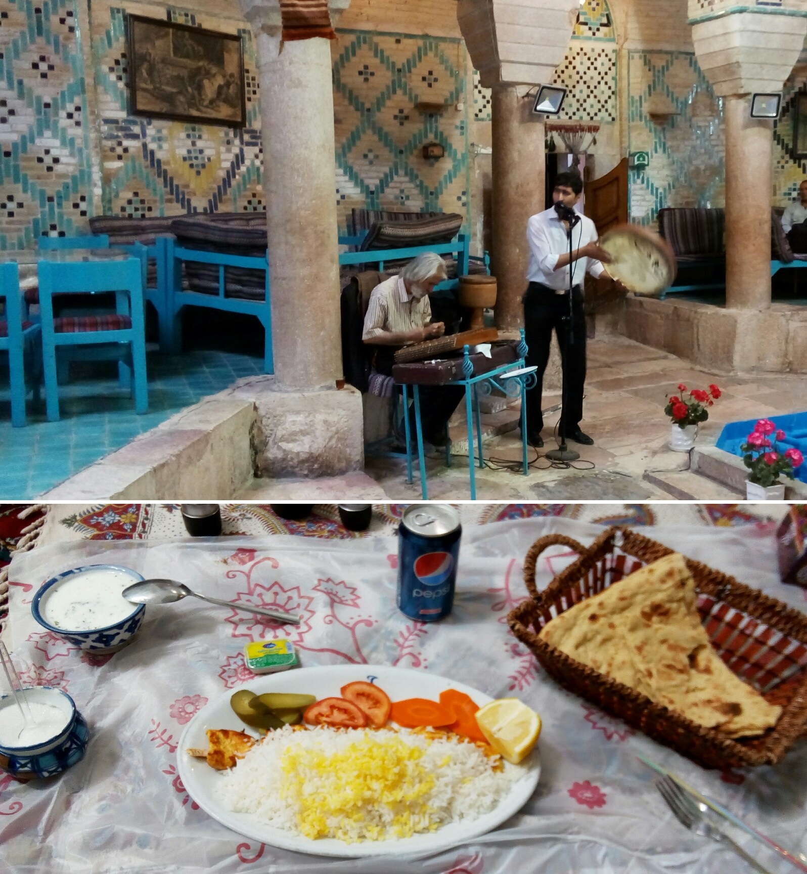 En medio del bazar encontré un restaurante con buena pinta (Hamam-e Vakil). Entré sin dudarlo porque mis tripas no me iban a permitir aguantar mucho más sin una buena dosis de energía. Cuando ya estaba comiendo apaciblemente en una de estas silla-mesa iraníes que tanto me gustan apareció un enorme grupo de franceses que, mientras esperaban por la comida, se dedicaron a hacerme fotos como si fuese una atracción local.