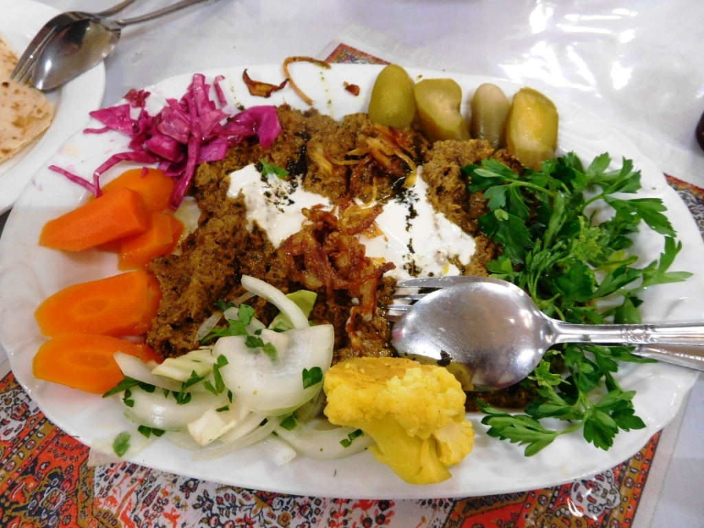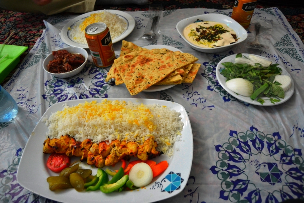 La comida iraní me ha gustado. Sin tener mucha variedad, los distintos platos que he probado me han gustado todos y la forma de utilizar ciertos alimentos (yogur, berenjena, menta…) me ha parecido muy original y rica. Se come mucho cordero y pollo, arroz, pan y verduras, aunque poco pescado. Una dieta bastante sana y nutritiva.