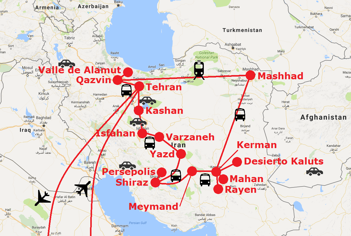 – Tren: hay varias líneas de tren que unen las ciudades más importantes. La línea del norte (Tabriz – Qazvin – Tehran – Mashhad). Conviene comprar los billetes con algunos días de antelación porque los trenes (especialmente los nocturnos) se pueden llenar. Yo viajé en tren nocturno de Mashhad a Qazvin en un compartimento con otras 3 personas, con asientos y literas cómodas y hasta televisión. Fueron 13 horas y pagué al cambio 30€.