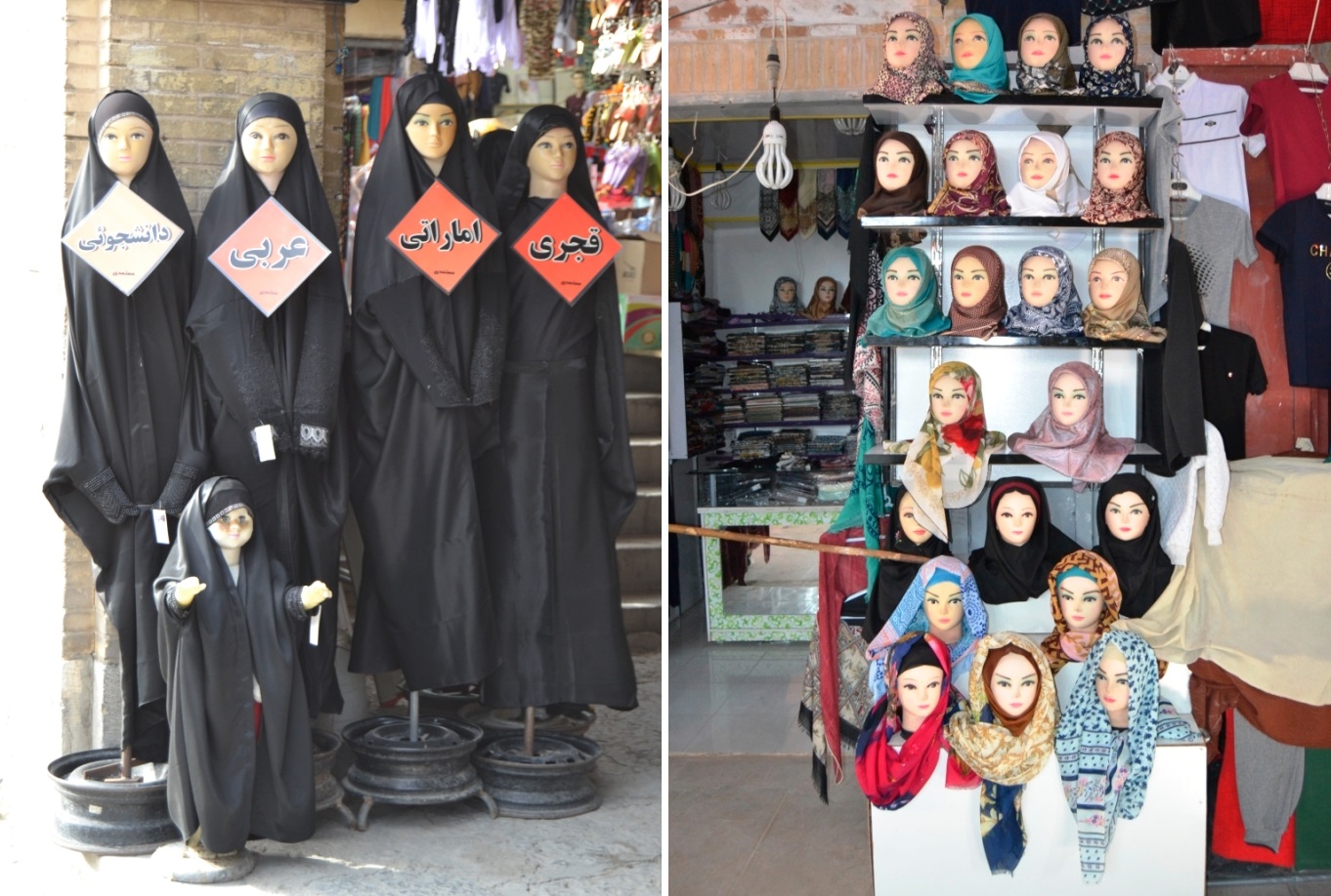 – Mujeres: es obligatorio en todo momento llevar el hijab, el «pañuelo», pero como se ve allí hay muchas formas de ponérselo y las chicas más modernas apuran al máximo y se les ve casi todo el pelo. La manga corta no puede sobrepasar el codo y el pantalón debe ser también largo. Las turistas también tienen que llevar el hijab (o algo semejante, porque se ven muchos «apaños»… jejeje). El calzado puede ser cualquier cosa, incluso sandalias abiertas.