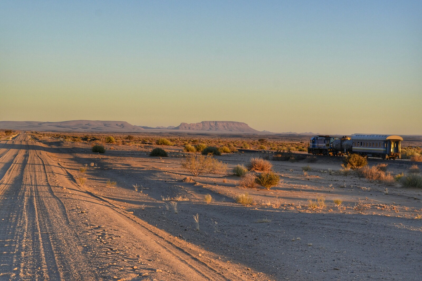 Por el camino, a la vez que se ponía el sol, fuimos conduciendo un rato junto a un mini tren (locomotora y un vagón) que parecía ir directo hacia las montañas y el horizonte. El único tren que hemos visto en el país por ahora, y para eso iba totalmente vacío, como si fuese un recorrido de prueba.