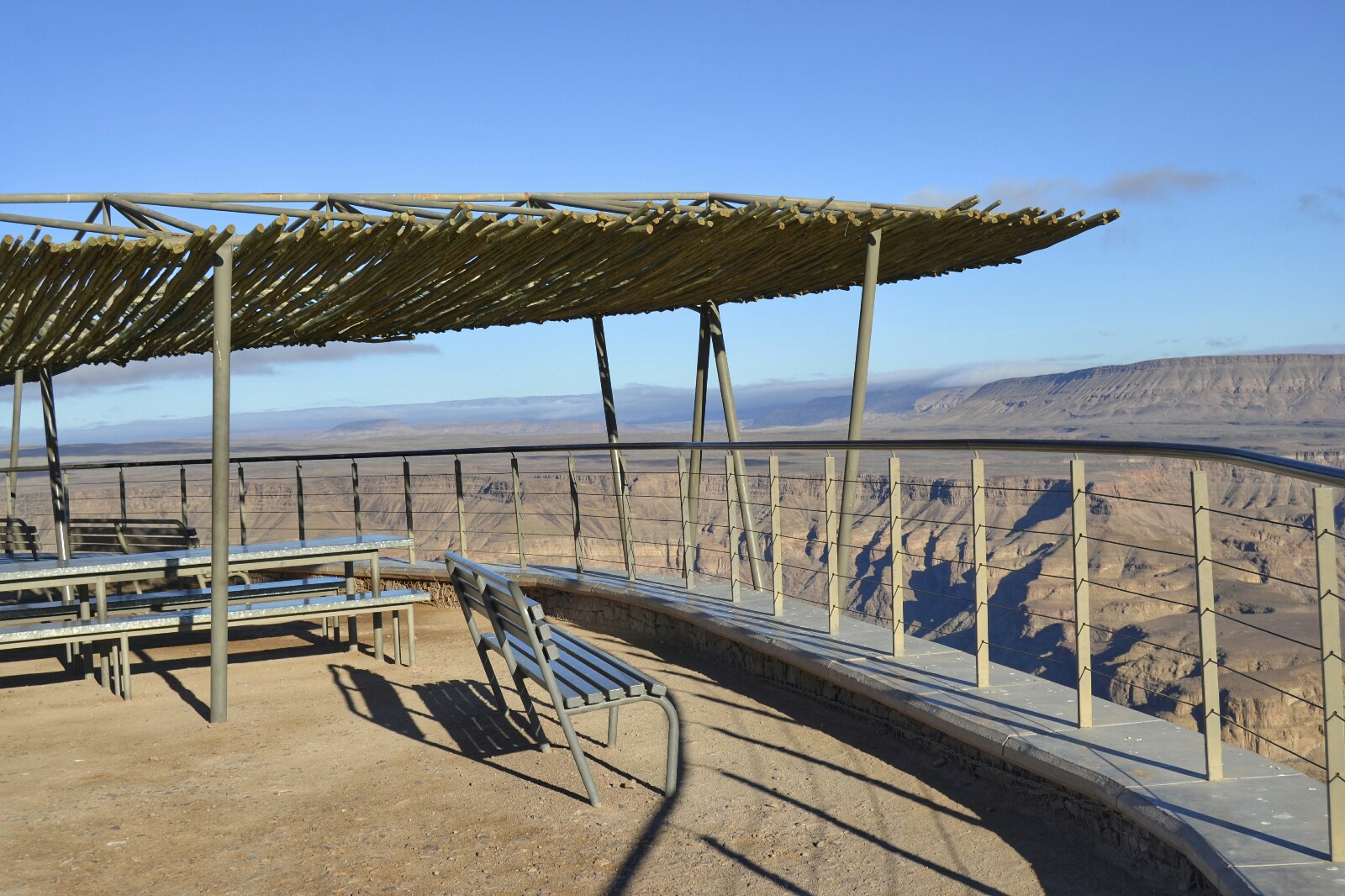 ¡Y fue todo un acierto! 10 kilómetros separan el campsite del mirador, así que llegamos en un santiamén. Estábamos totalmente solos, y pudimos disfrutar de un merendero chulísimo con sillas, mesas y unas espectaculares vistas del cañón como si fuese privado.