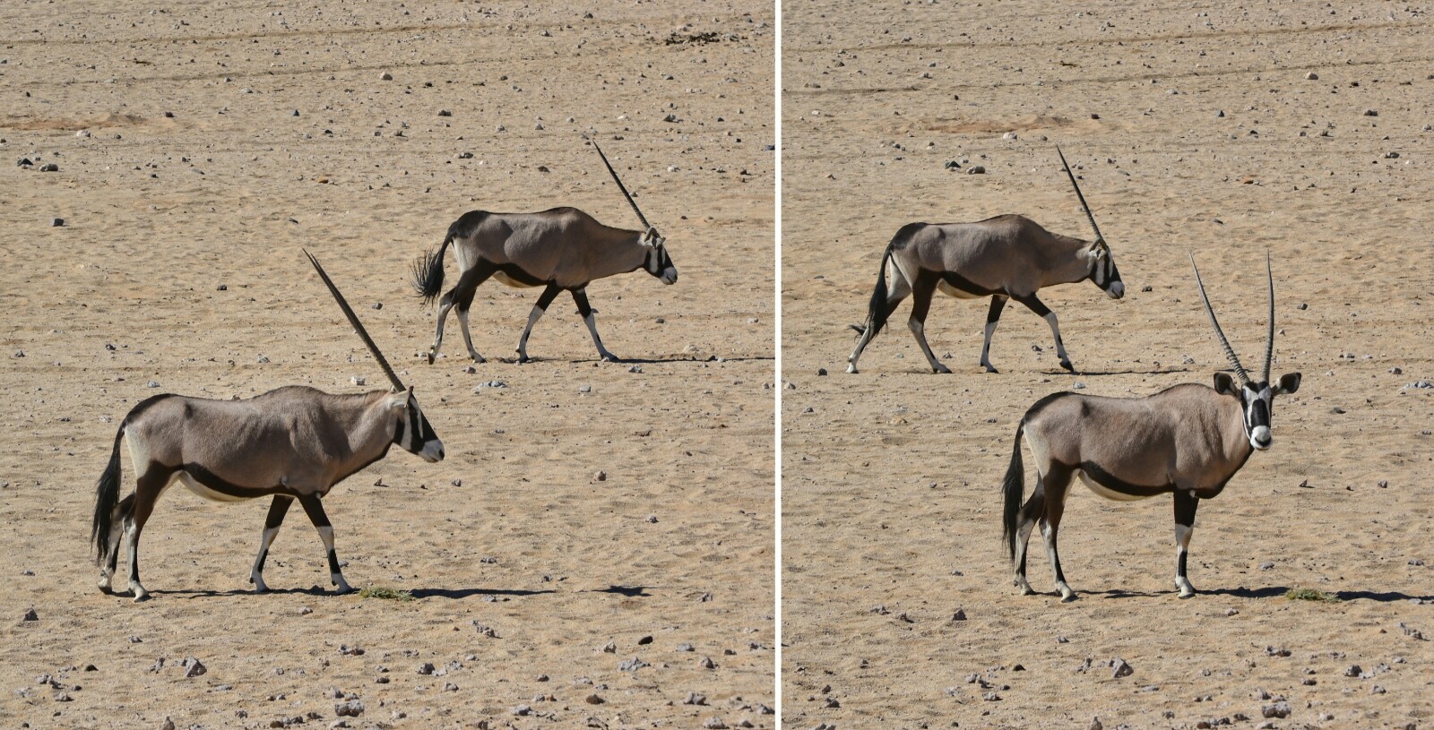 No tuvimos la suerte de verlos de cerca. Sí que pudimos distinguir con los prismáticos a una veintena de ellos en la lejanía, pero la parada valió igual la pena. Aprovechamos el cobertizo para comer algo y maravillarnos con los distintos grupos de Oryx que pasaban por delante de nuestros ojos para beber el agua acumulada en el agujero.