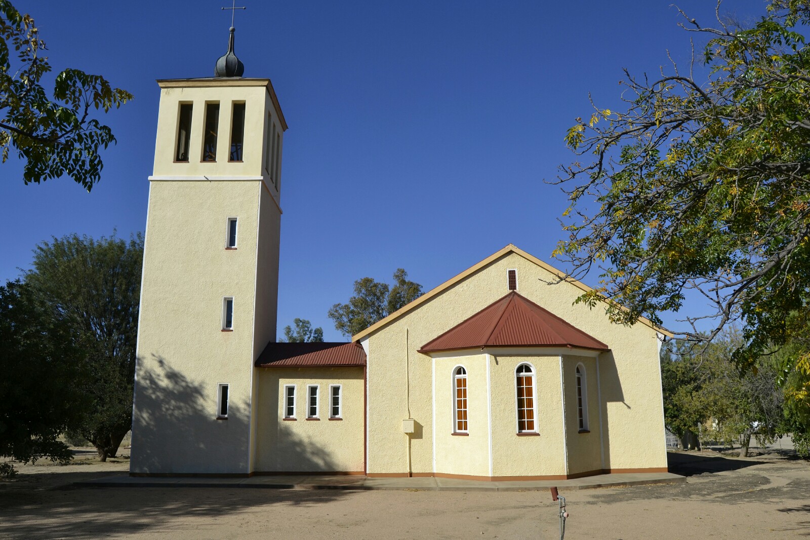 Más al norte pasamos Windhoek (donde cerramos oficialmente el bucle del sur) y paramos en Okahandja. En la guía ponía que era un buen sitio para hacer un descanso: cerca de la carretera principal, con un buen mercado de artesanía, supermercado, una iglesia que visitar y una (trágica) historia relacionada con los Herero y los Nama.