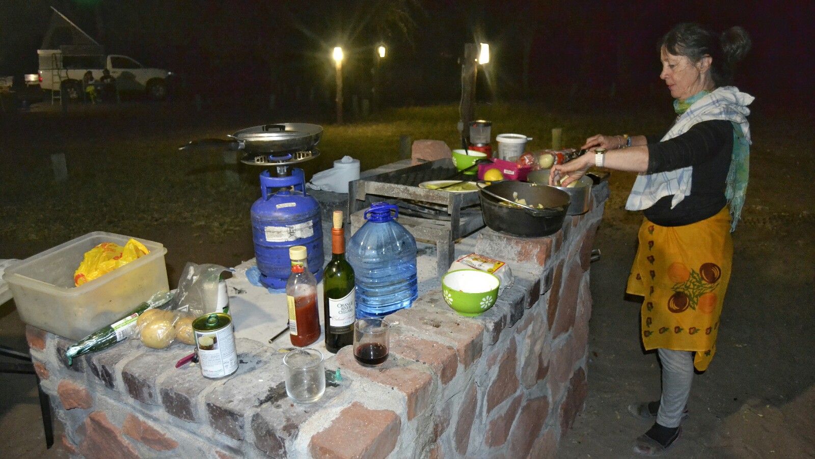 Paramos primero al pasar Keetmanshoop para hacer la cena en uno de estos apeaderos. Hacía bastante viento, pero nos las apañamos para que funcionase el hornillo de gas y así recargar bien el depósito interno, que es tan importante o más que el del coche (ése lo habíamos recargado ya en una gasolinera de Keetmanshoop donde aprovechamos para comprar pan).