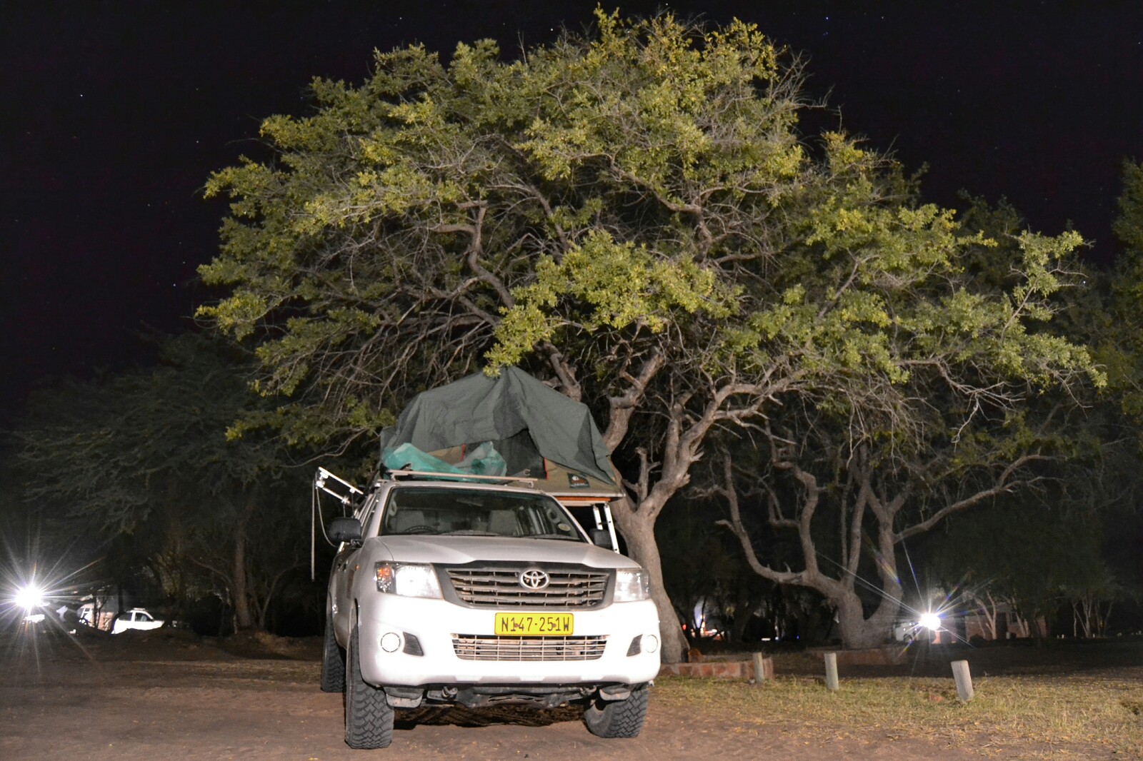 La oscuridad total cayó sobre nosotros a las 18:00 y aún no habíamos llegado a la carretera asfaltada, pero tenía energía suficiente como para seguir conduciendo. Además, no teníamos pensado dormir en ningún campsite. En las carreteras importantes de Namibia hay, de vez en cuando, unos apeaderos muy monos con mesa y sillas bajo un árbol. Uno de ésos iba a ser nuestra parada nocturna para dormir (pero sin montar la tienda, dentro del coche, para estar más seguros y ahorrar tiempo por la mañana).