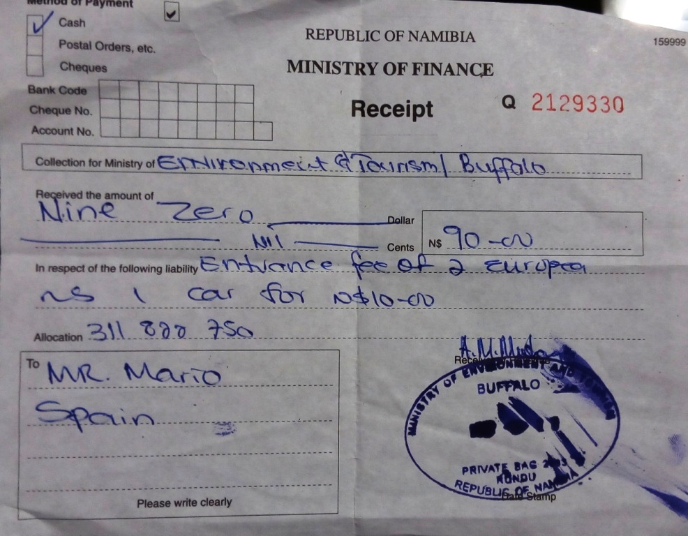El precio que pagamos era exactamente el mismo que en el Mahango Core Area (40 NAD por persona y 10 NAD por coche). Y si en Mahango habíamos estado prácticamente solos… ¡aquí solos totalmente! Un safari 100% privado por 3€ cada uno, me río yo de lo que pagan los millonettis que se van a los safaris de lujo.