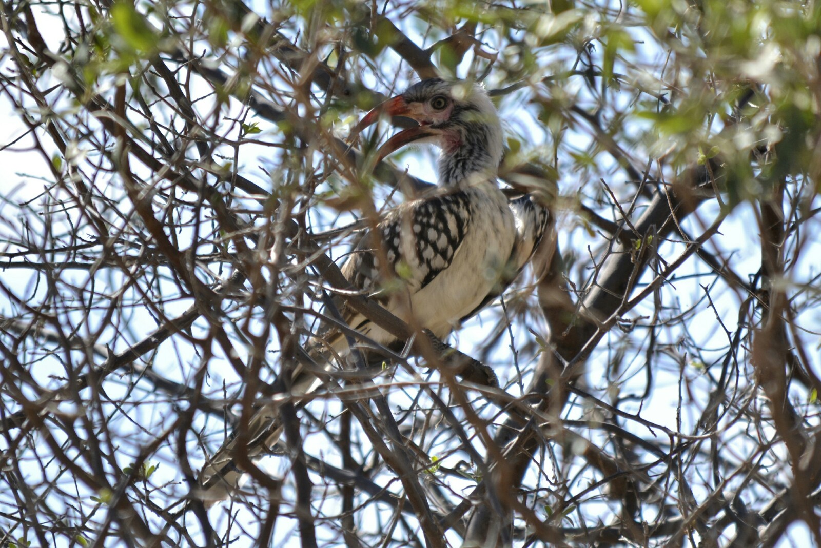 Oculto entre las ramas de un árbol se nos apareció un Toco de Bradfield. Una curiosa ave de más o menos medio metro de longitud que destaca por sus colores y su pico. Tiene pinta de polluelo con mala leche, pero no deja de ser interesante.