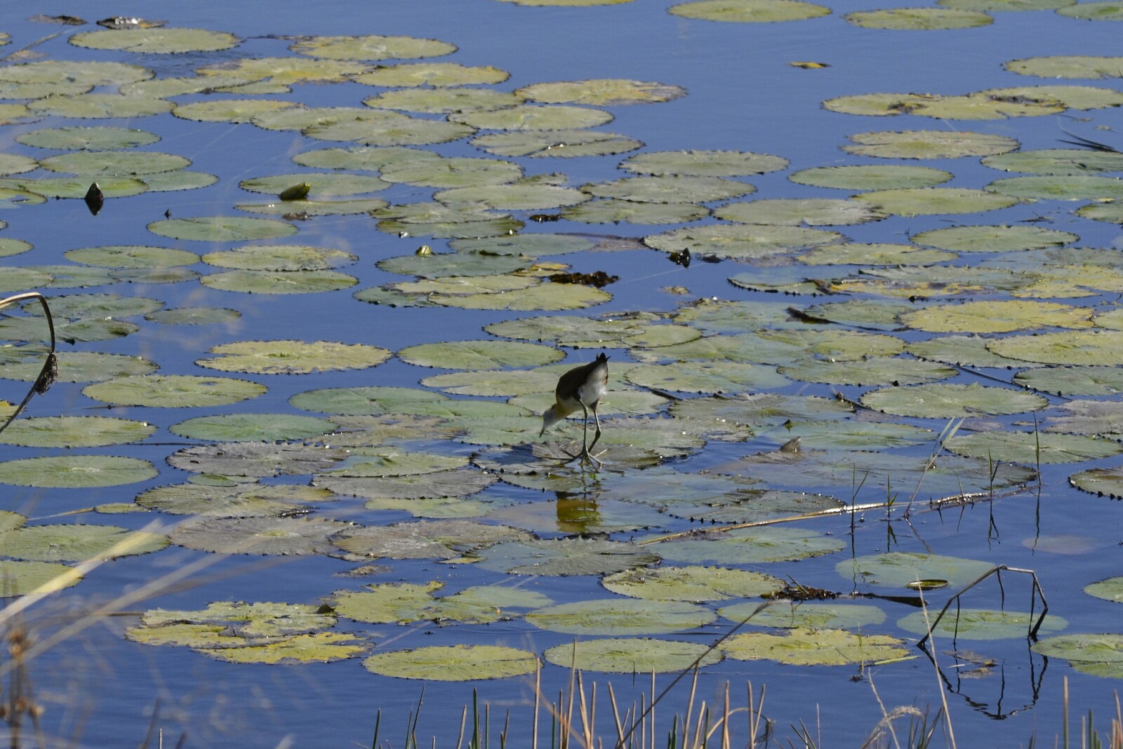 Al poco rato llegamos a una inmensa y apacible laguna cubierta de muchos nenúfares y alguna que otra Jacana Africana caminando tranquilamente por encima buscando algo de comida.