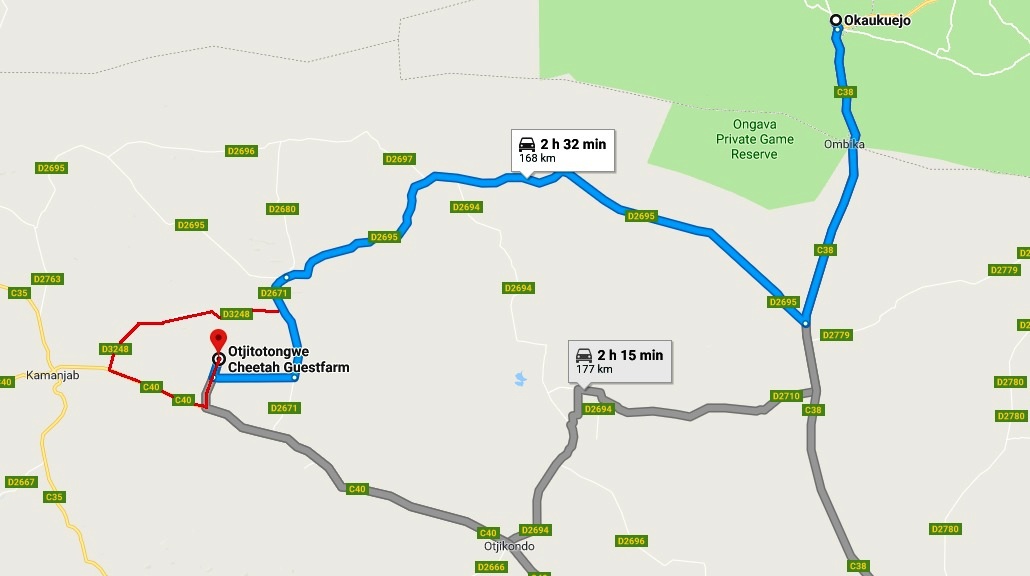 Según la ruta nos faltaban solamente 15 km para llegar a la granja, pero nos pareció un camino privado más que una pista para 4×4 así que dimos una vuelta más larga siguiendo por la D3248 hasta conectar con la C40 cerca de Kamanjab y, de ahí, giramos a la izquierda en dirección Otjikondo hasta que encontramos el desvío a la granja de guepardos.